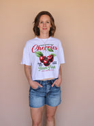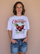 Get ready to have a cherry good time in our FARM FRESH CHERRIES GRAPHIC CROP TOP! This playful top features a fun "cherries, farm fresh" design that will add a pop of color to any outfit. Made with high-quality materials, it's as fresh as picking cherries from the farm.
