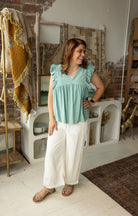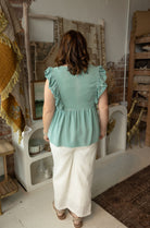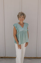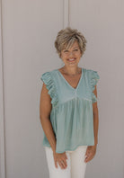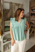 Dusty teal acid washed tank top with vneck and ruffle sleeve detail