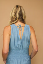 This dusty blue maxi dress features a playful double V-neck and a smocked waist that flatters your figure. The sleeveless design and tie-back detail add a breezy, effortless charm perfect for sunny days or casual outings. Embrace comfort and style with this easygoing, chic dress.
