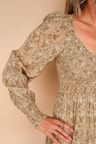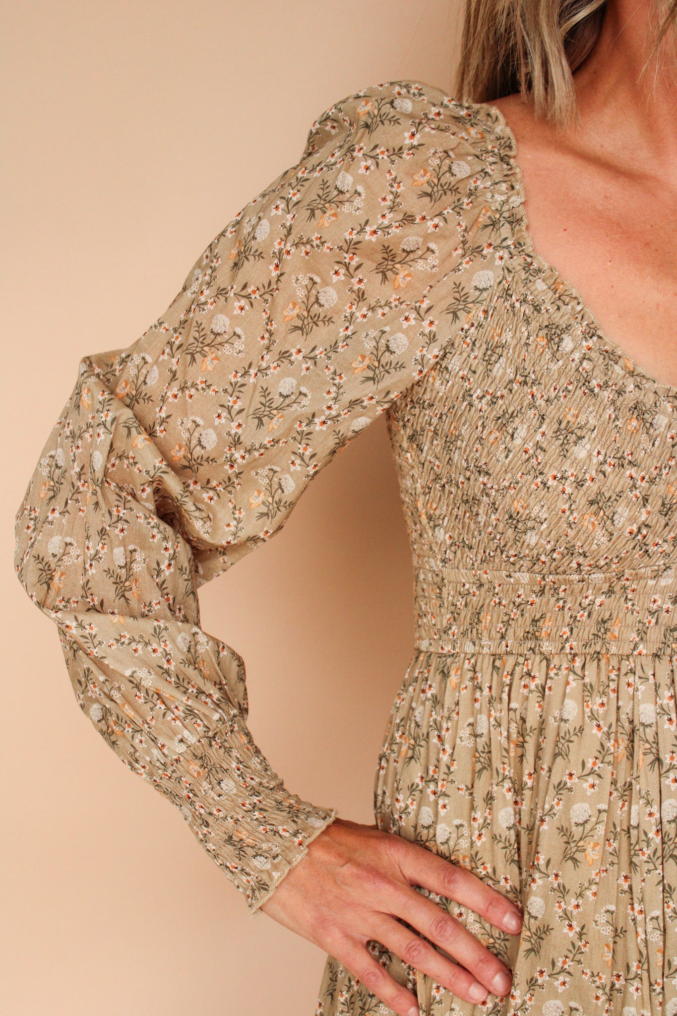Made from a soft and breathable cotton floral fabric, this dress features a smocked bodice and voluminous sleeve ends for a flattering and comfortable fit. Plus, it has handy side pockets for all your essentials. Perfect for any occasion!