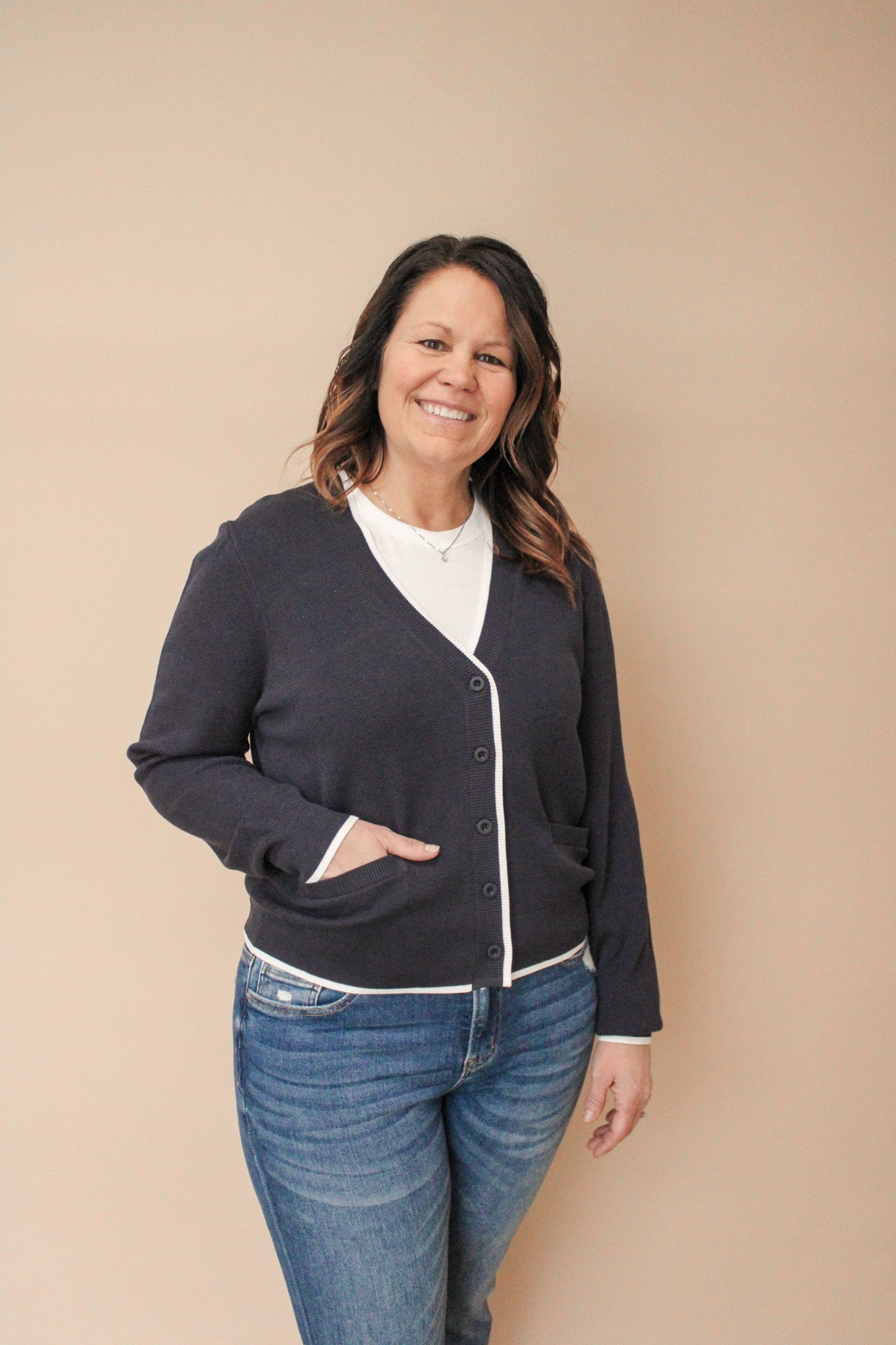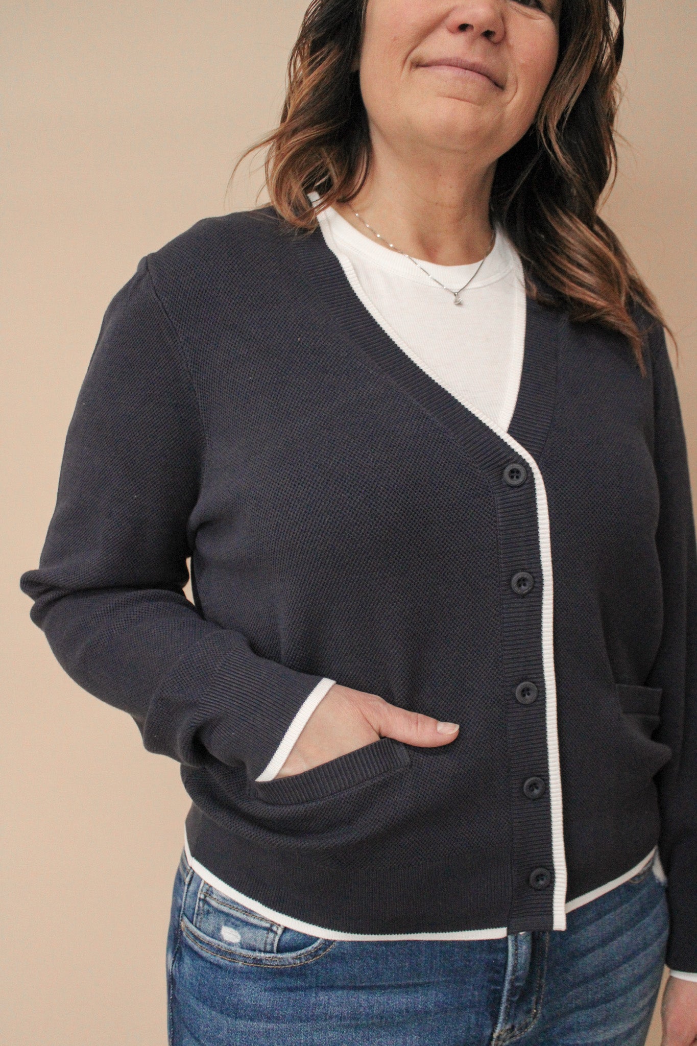 This so-soft and stretchy cardi is a classic for any wardrobe. Featured with a contrast piping detail, v-neckline and dual front pockets.