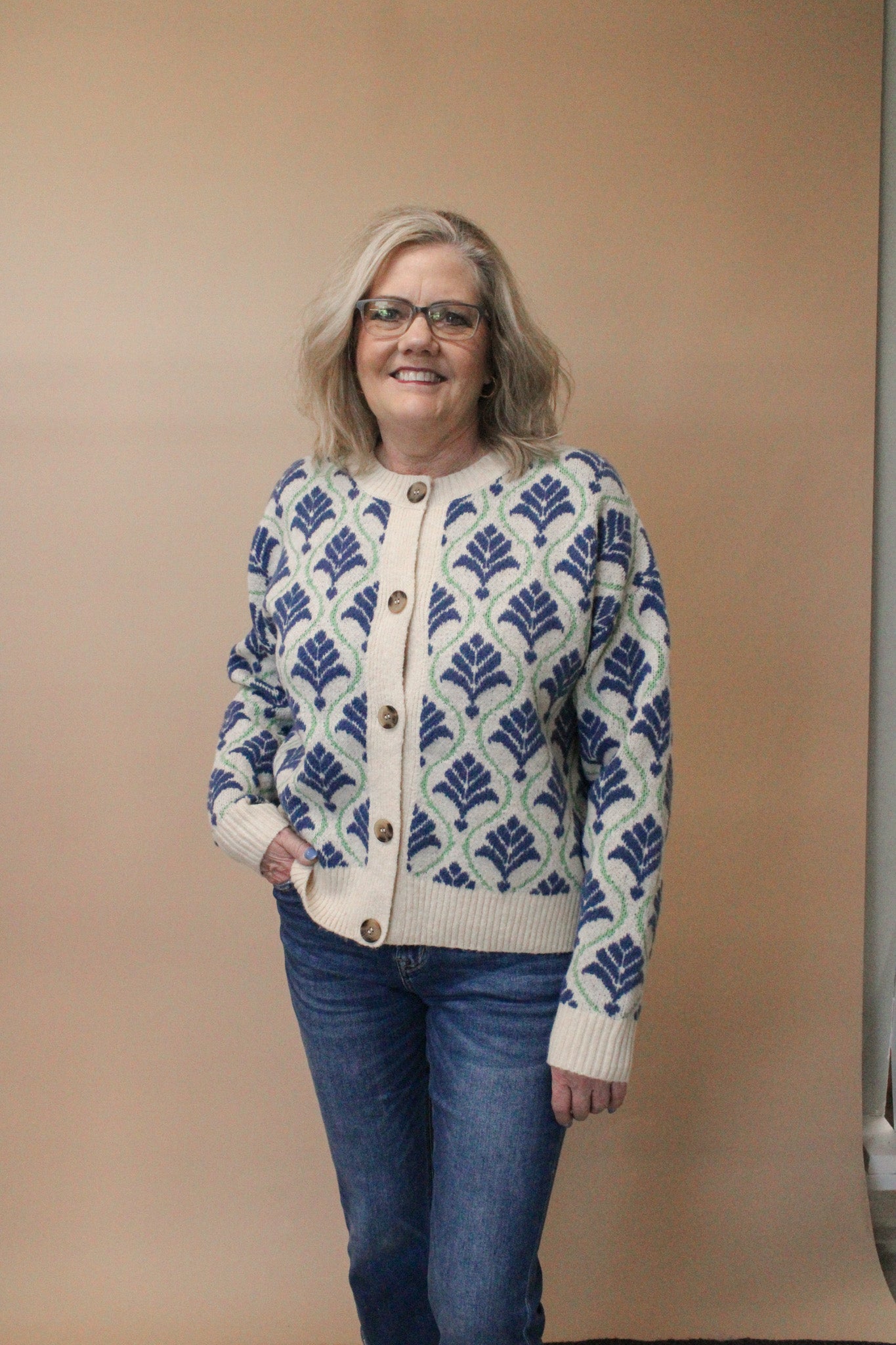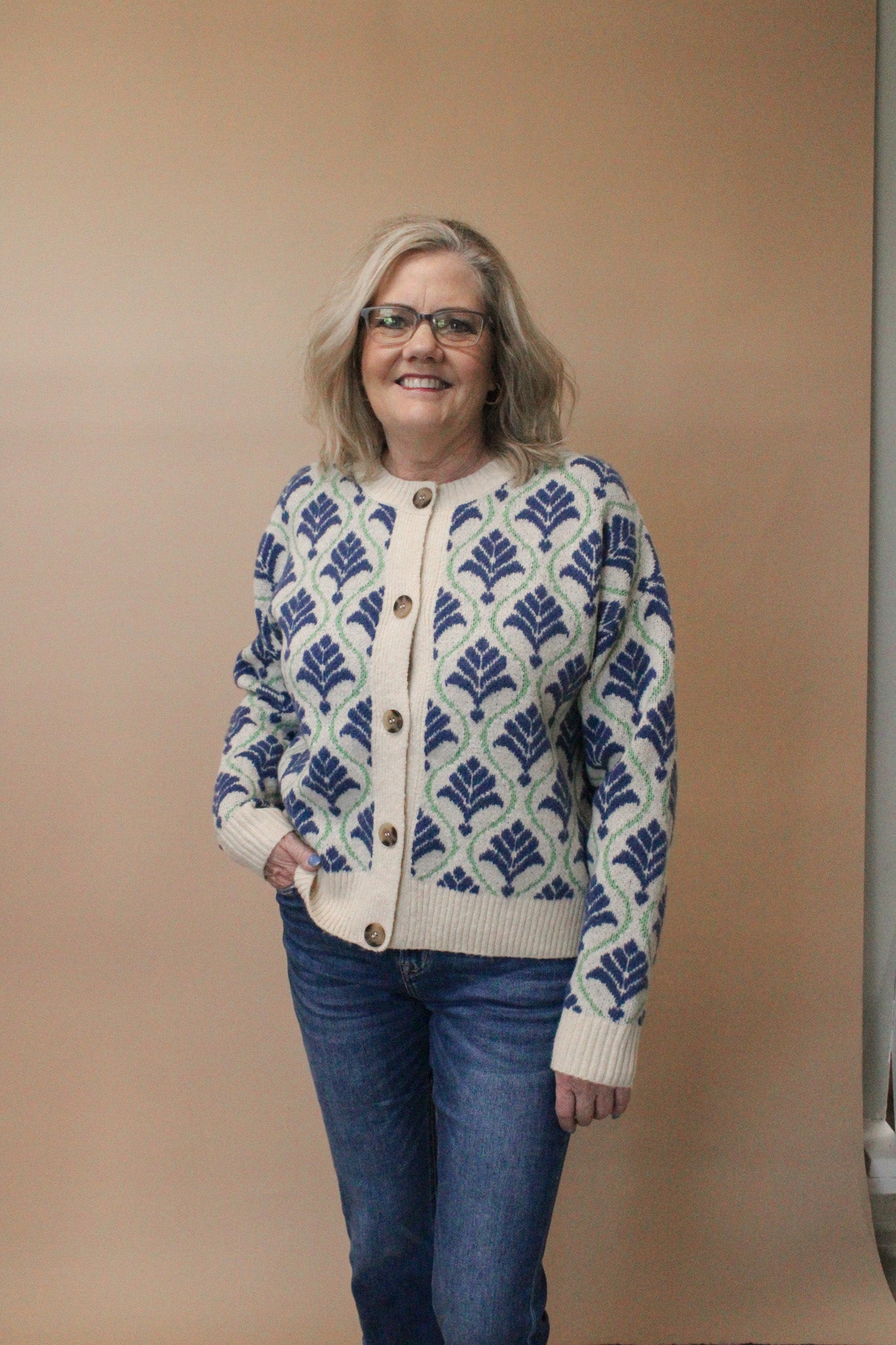 Throw on the CEDAR Cardigan and instantly elevate your everyday look! This playful piece features an eye-catching allover intarsia-knit abstract print that adds personality to any outfit. With its relaxed fit, round collar, and button-front closure, it's the perfect layer for effortless style. Long sleeves and ribbed trim keep things polished, while the hip-length cut flatters every frame. Dress it down with jeans and sneakers for brunch, or style it up for casual outings. Comfort meets chic in this must-have wardrobe staple.