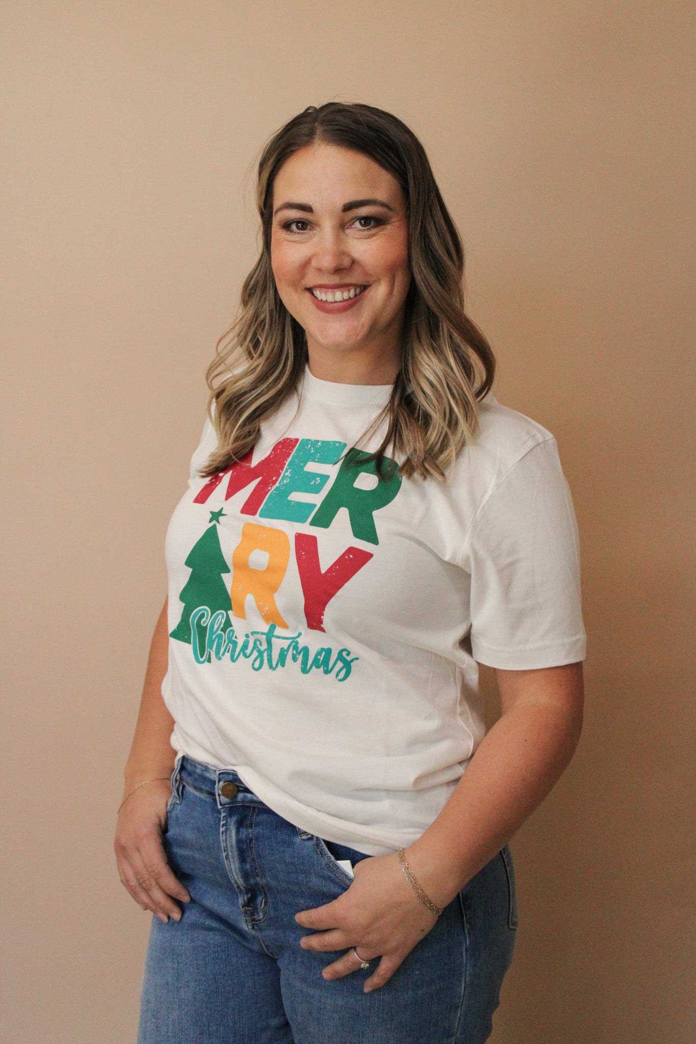 A beautiful multi-color MERRY Christmas graphic tee on a basic, vintage white Bella short sleeve t-shirt.
