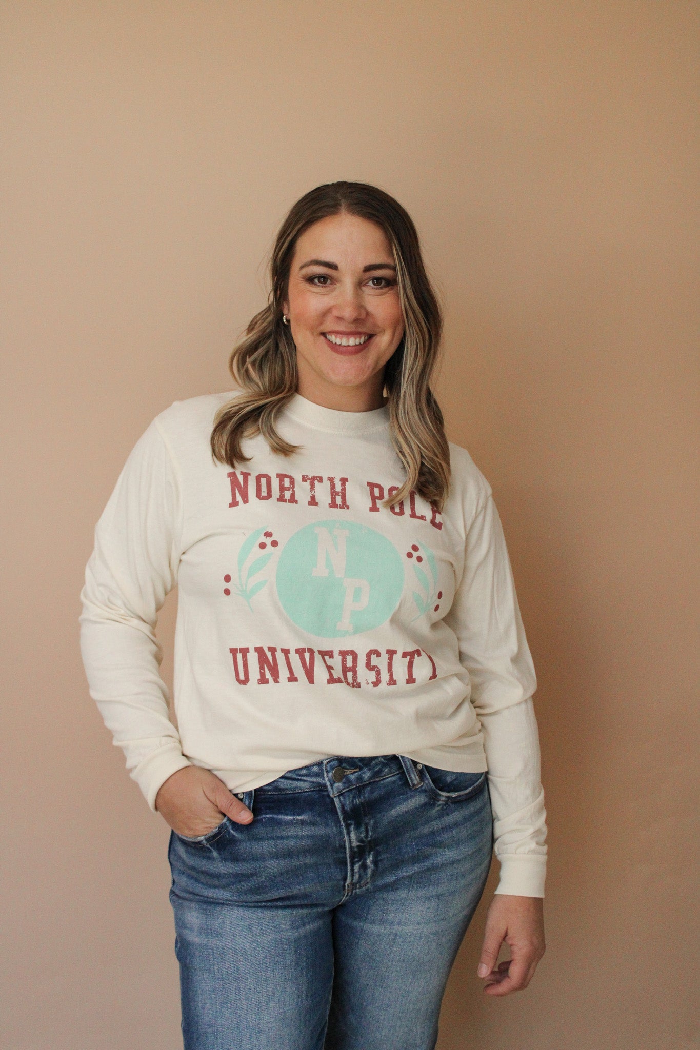 North Pole University collegiate tee on a schnazzy long sleeve graphic tee.