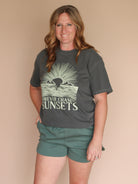 For the ones who find peace in golden skies and quiet horizons. This gray Comfort Colors tee features a soft, vintage-style imprint in mint — a serene sunset scene paired with the words “Forever Chasing Sunsets.” The relaxed, washed-in feel and classic Comfort Colors fit make it perfect for winding down, road tripping west, or soaking up golden hour on the porch. It’s effortless, airy, and made for the sunset chasers at heart.
