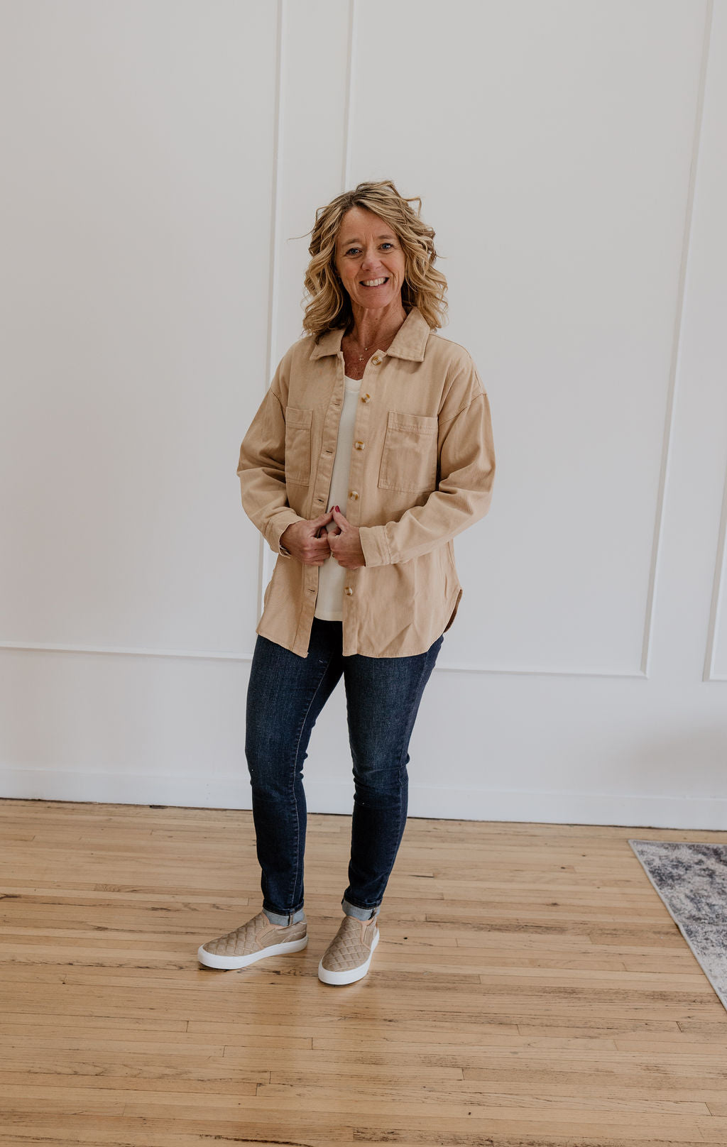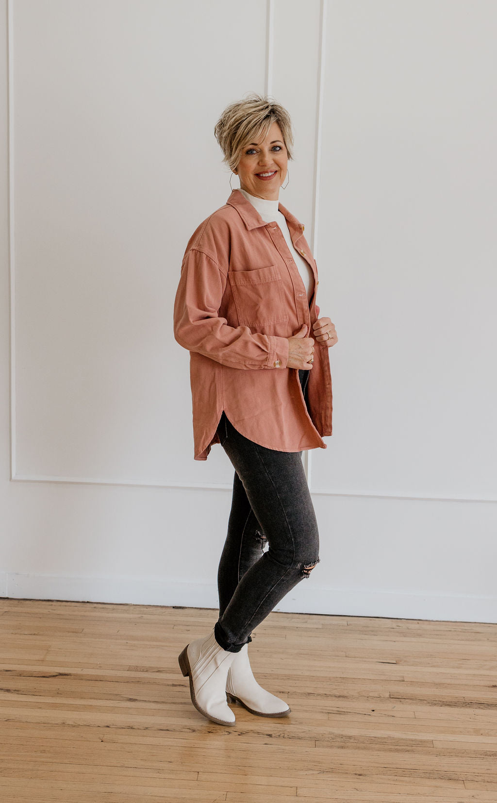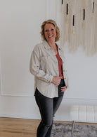 Meet the perfect solid shacket of your dreams! This lightweight layer is just what you need for those cool nights. Perfect for a cool casual look with it's relaxed and oversized fit. Featuring button front closure, front pockets and tortoise shell buttons
