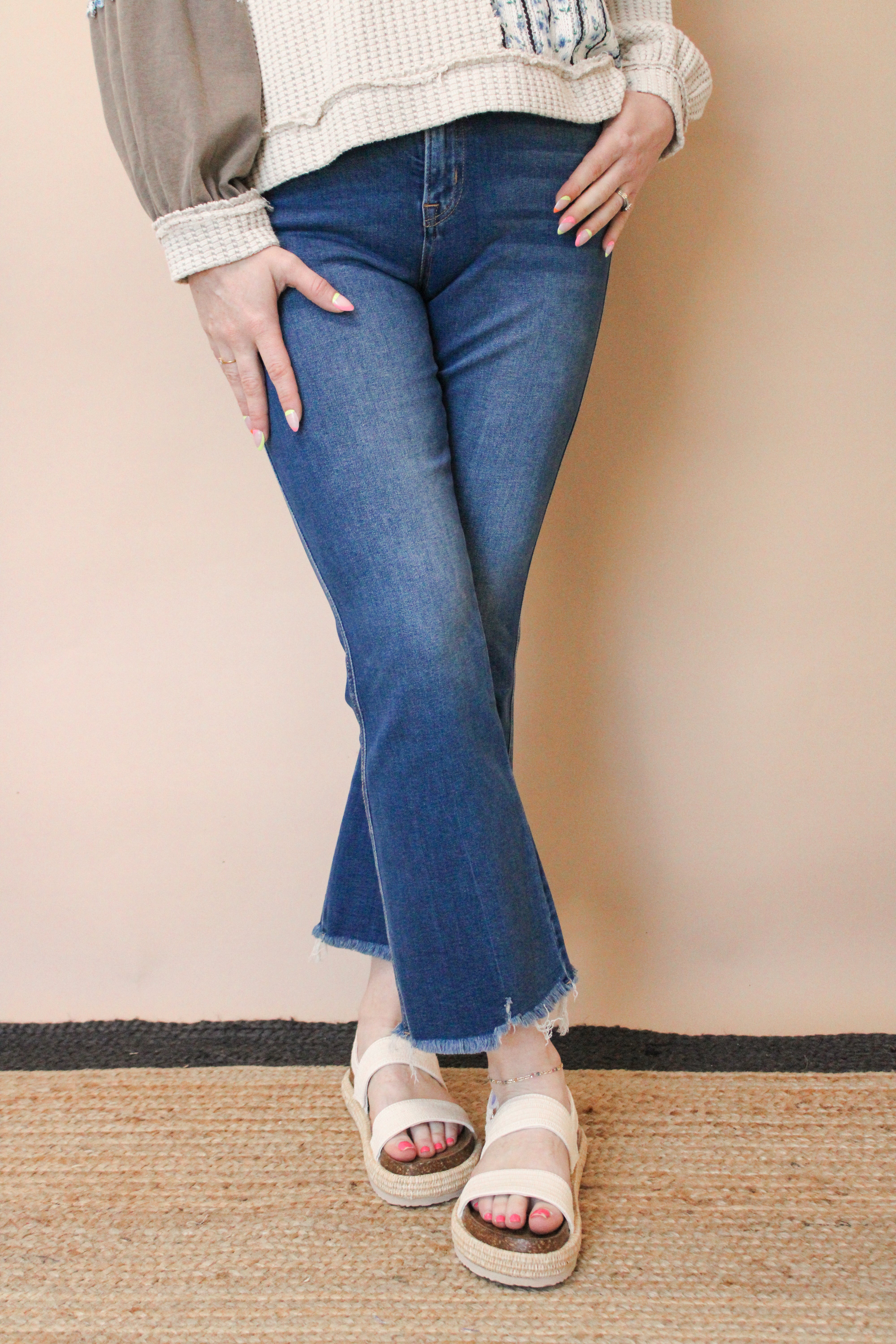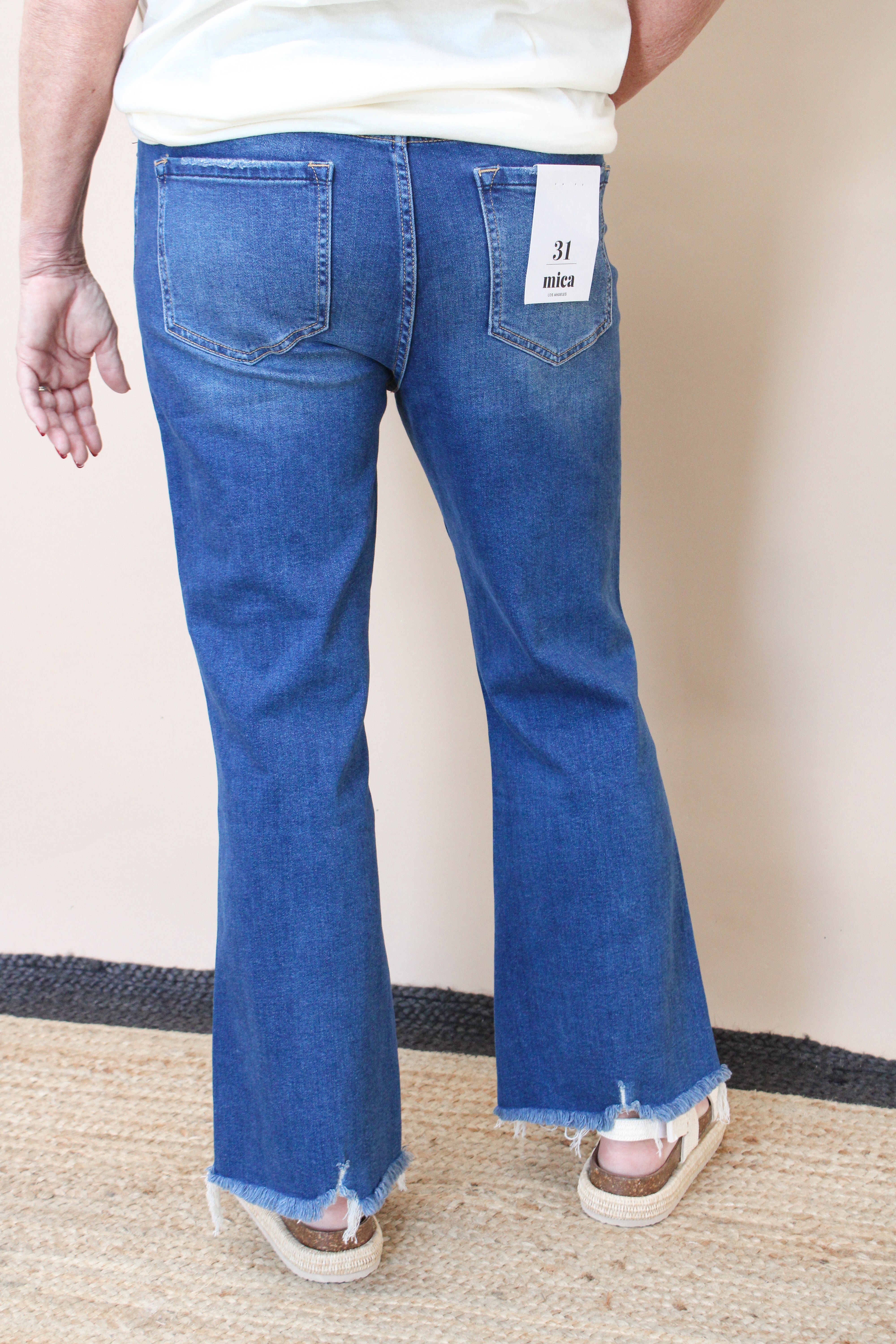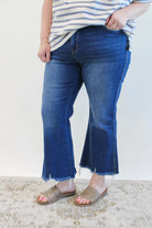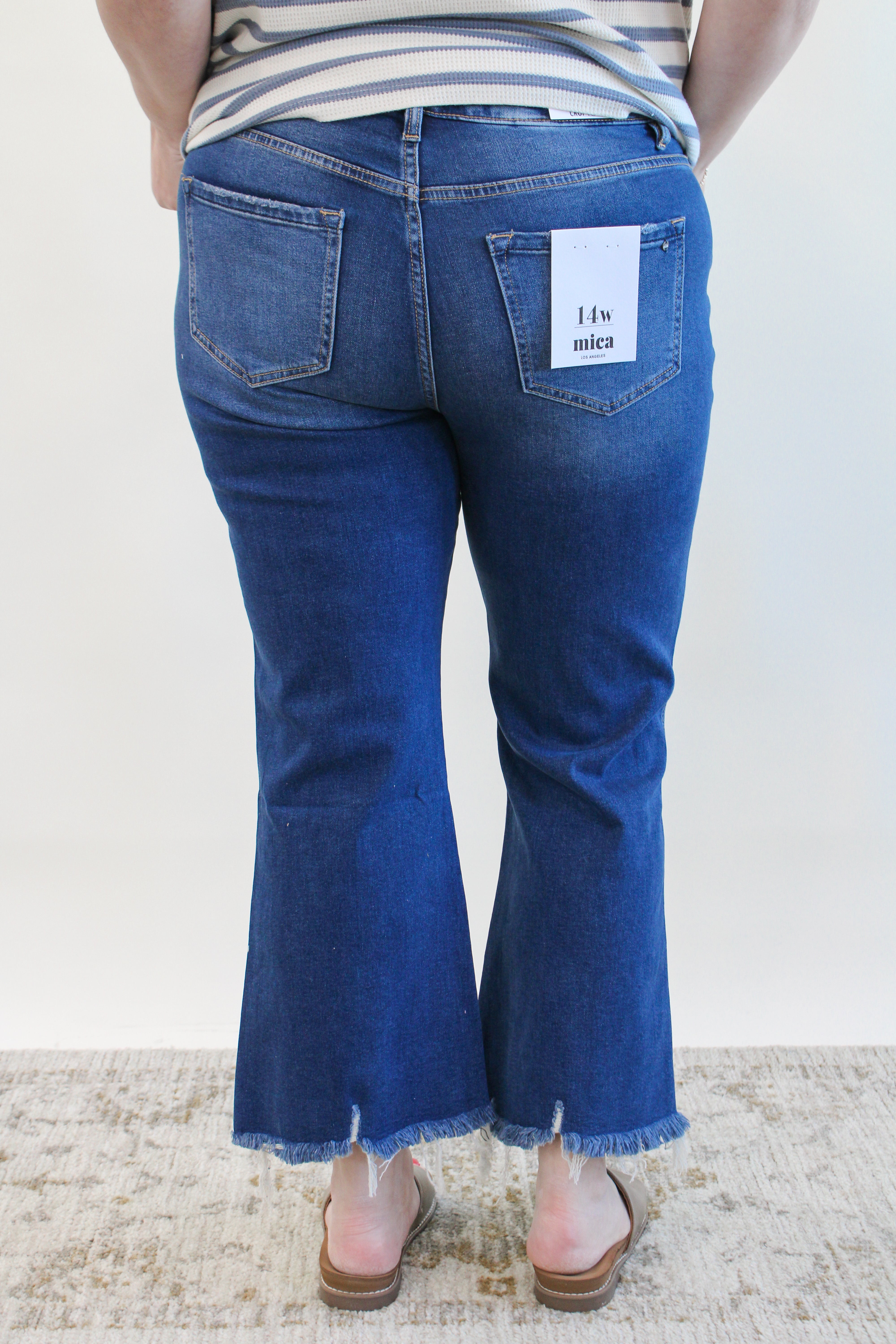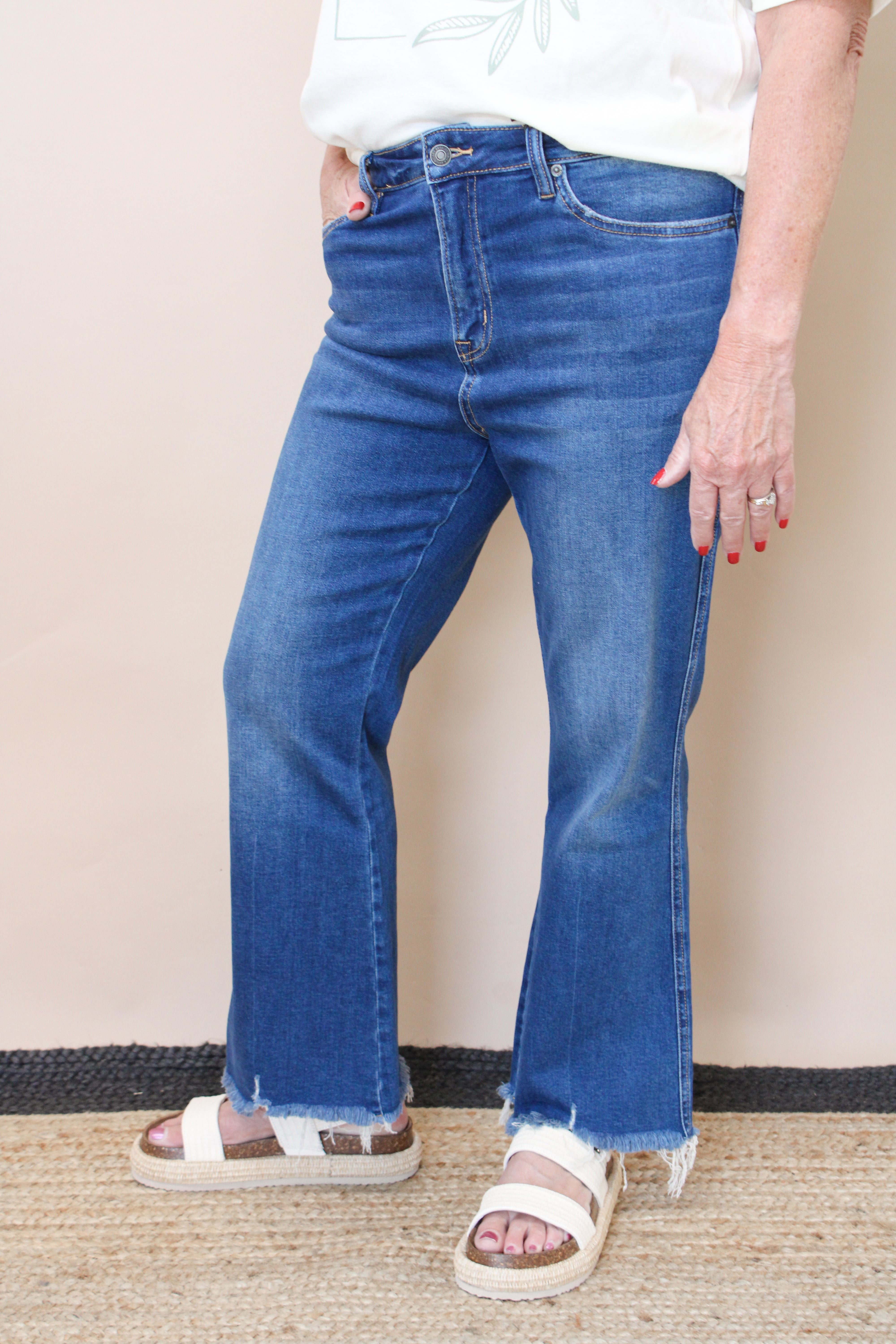 Up your denim game with our SHAYLA REG/CURVY HIGH RISE CROP FLARE jeans. Crafted with 82% cotton, 5% polyester, 12% rayon, and 1% spandex, they provide the perfect balance of comfort and stretch. The high rise and uneven hem add a touch of flair to your look. Get ready to rock these with a front rise of 10 1/4", inseam of 27", and leg opening of 18 1/2".
