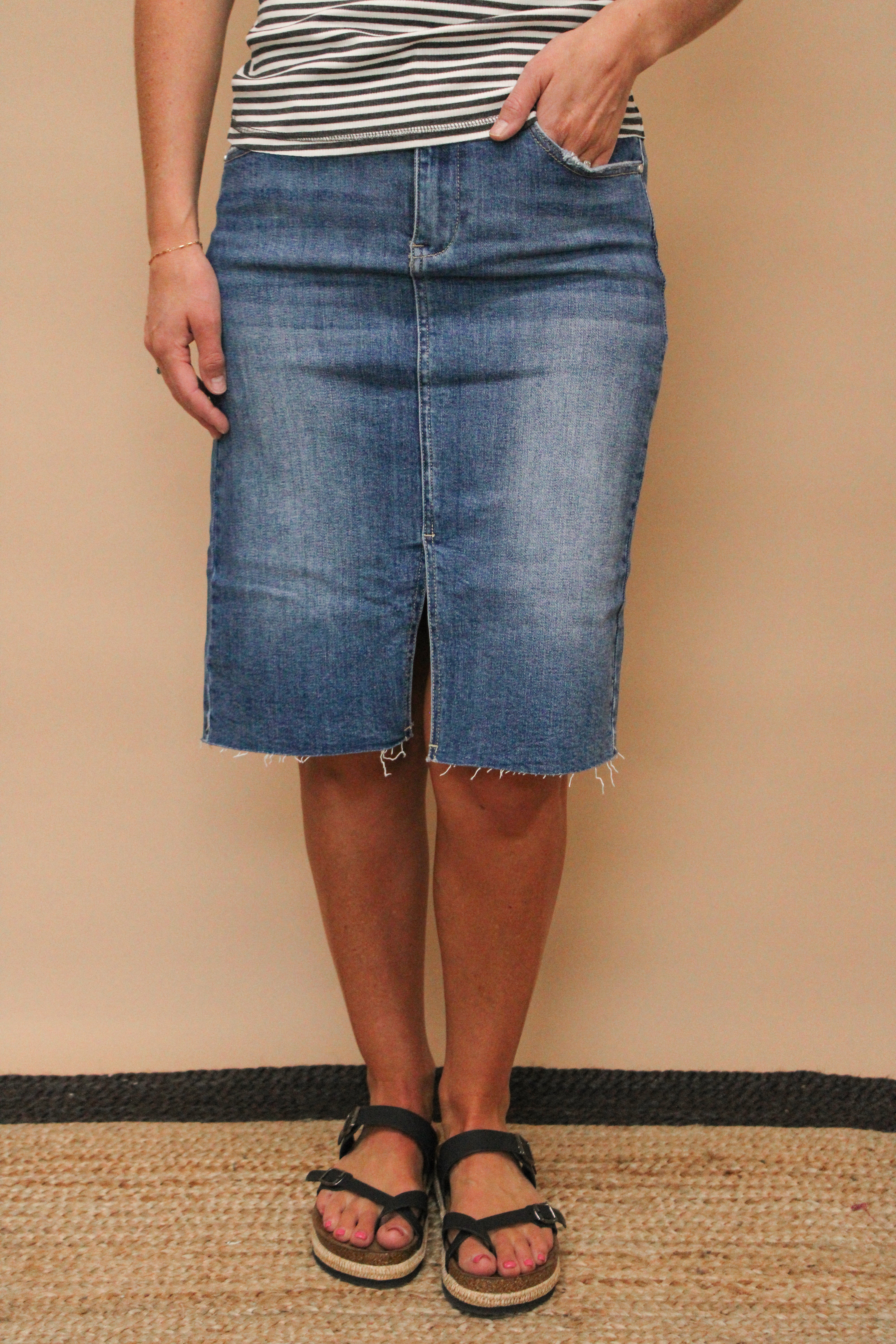 AINSLEY REG/CURVY HIGH-RISE FRONT SLIT DENIM SKIRT