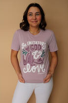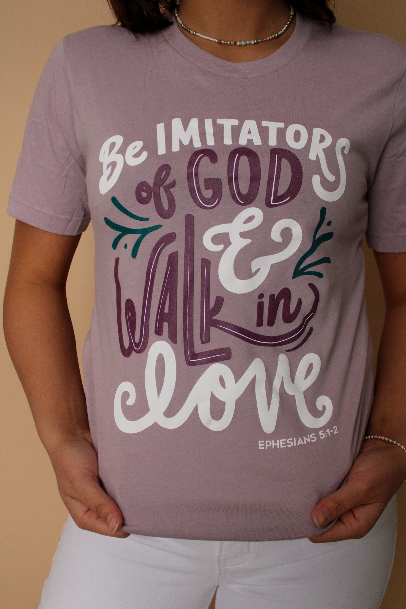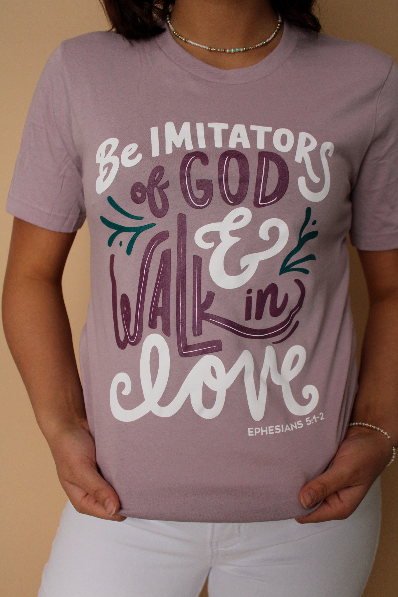 This soft violet graphic tee features an uplifting message inspired by Ephesians 5:1–2: “Be imitators of God & walk in love.” Designed with a beautiful mix of bold and script lettering, the artwork blends white and deep plum tones with subtle green leafy accents for a modern, feminine look.