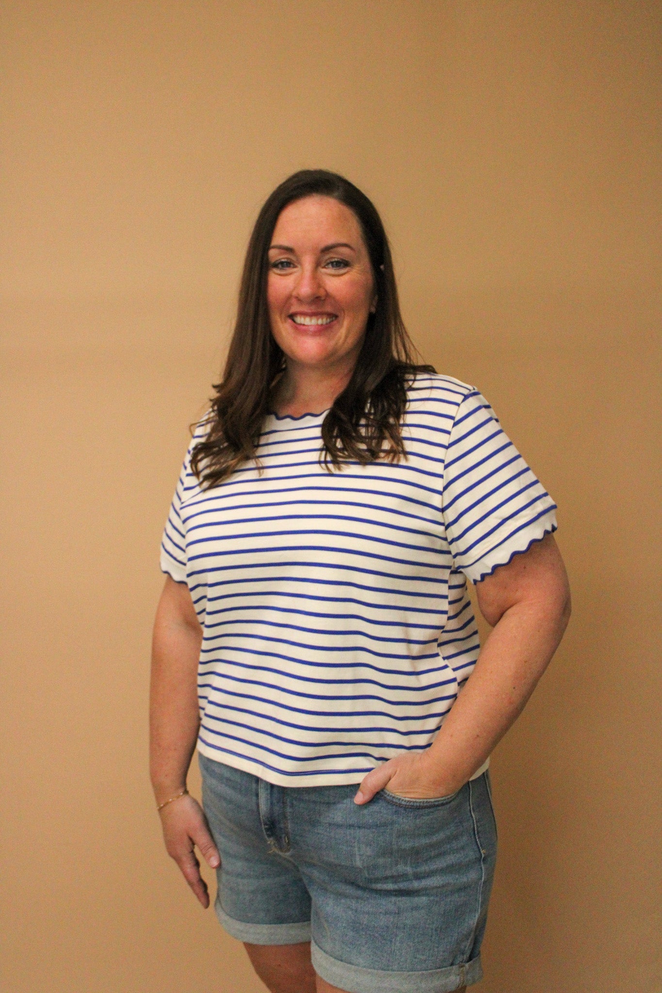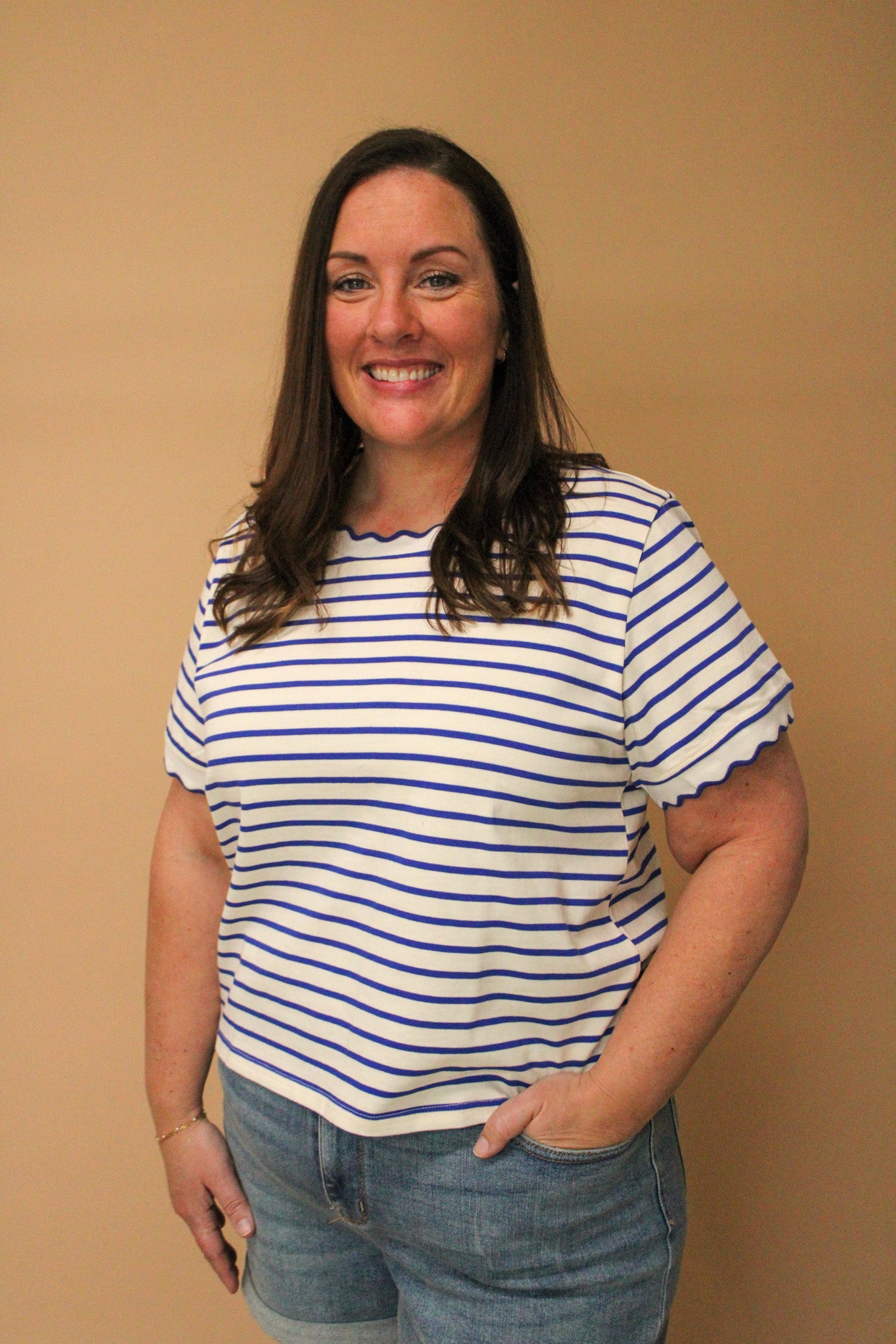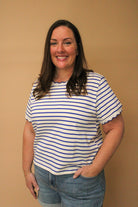 Embrace nautical charm with the Julian Striped Top, a playful take on timeless seaside style. This boxy-fit essential features crisp stripes paired with delicate scalloped edging that frames the crew neckline and short sleeves in contrasting trim for added visual interest. Crafted from 100% cotton, it's breathable and comfortable for everyday wear. Perfect for casual outings or layering with your favorite pieces.