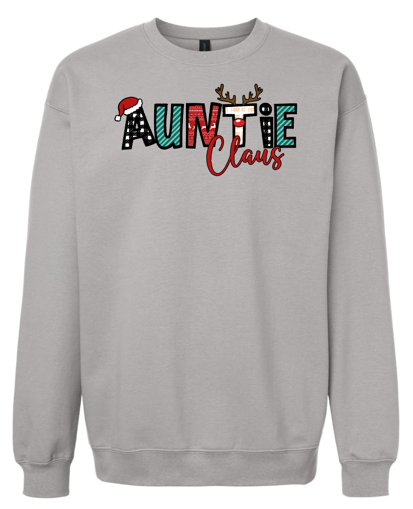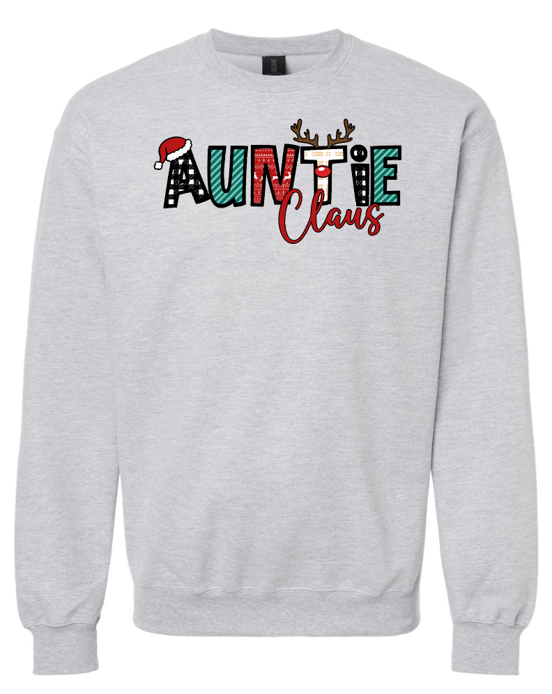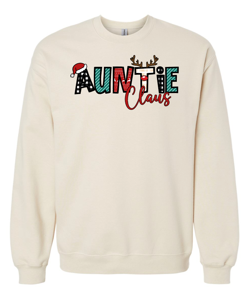Get festive in style with our Auntie Claus crewneck — the perfect holiday sweatshirt for every proud aunt! Featuring bold patterned lettering, a Santa-hat accent, and a playful Rudolph-inspired “T,” this cozy sweatshirt brings holiday cheer to any gathering.