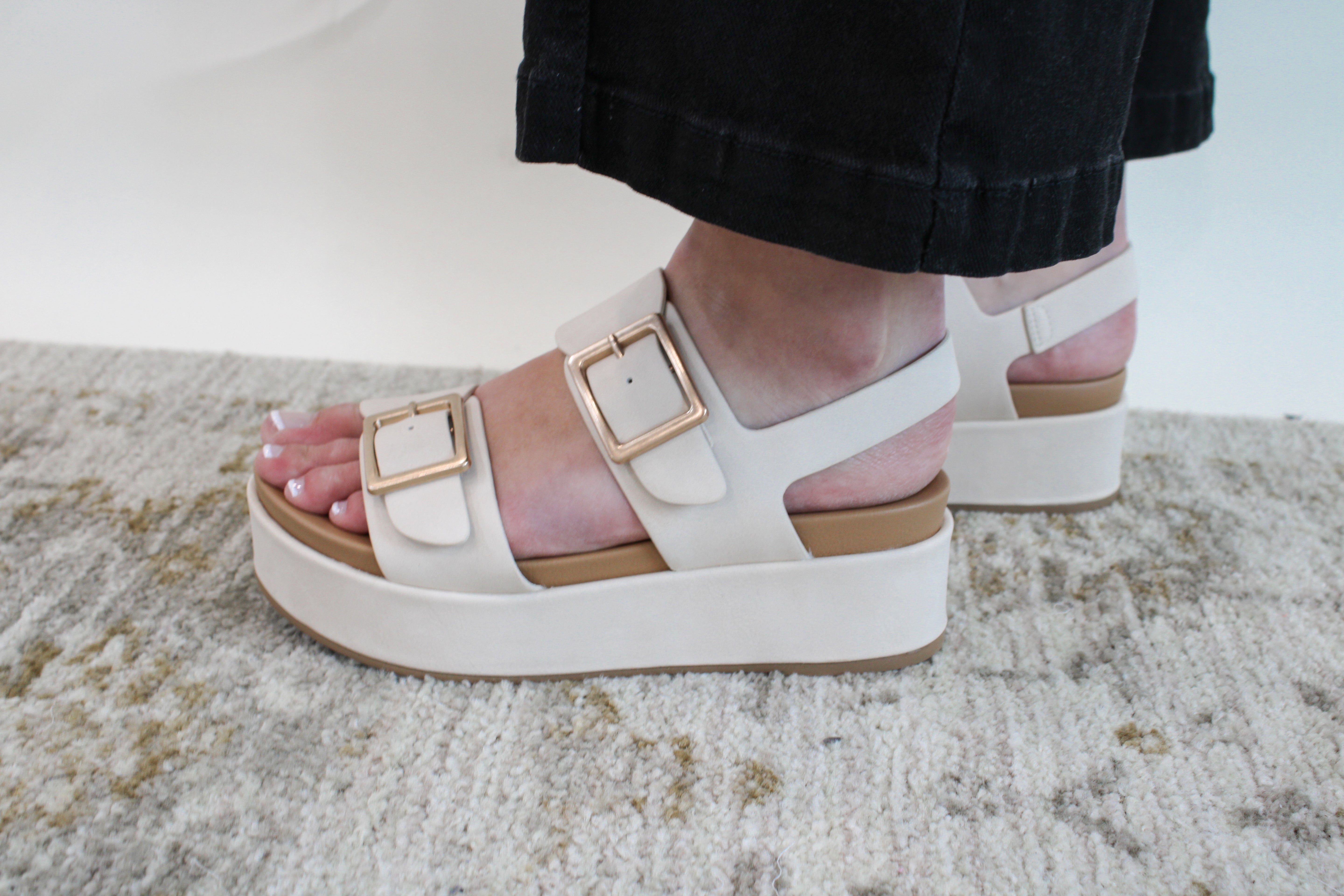 Elevate your style with the SADIE BUCKLE WEDGE SANDAL. This playful cream sandal features a trendy buckle and a comfortable wedge heel. Perfect for adding a touch of fun and flair to any outfit. (Buckle up, buttercup - this sandal will take your style to the next level!)