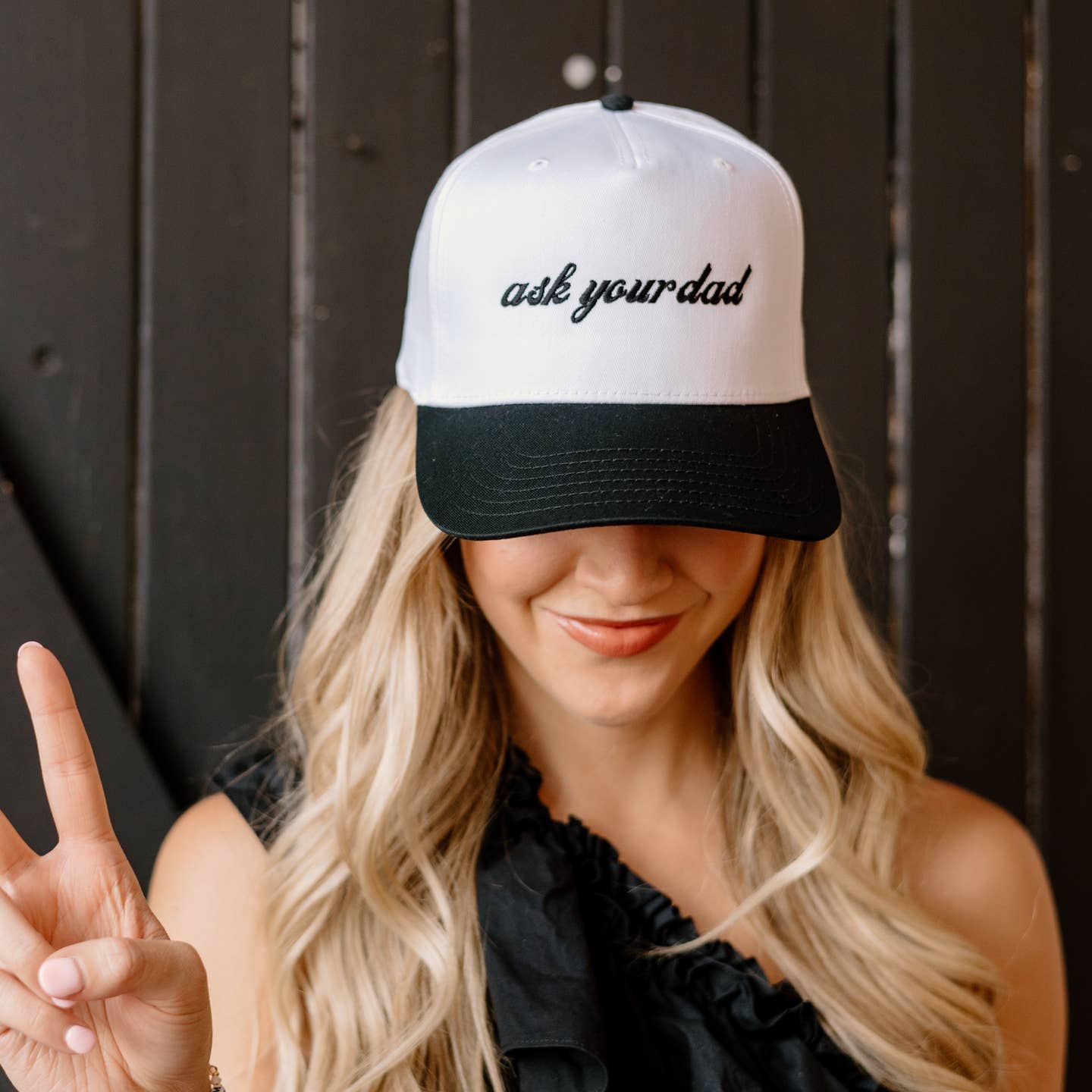 Introducing our GO ASK YOUR DAD TRUCKER HAT - the perfect accessory for fun-loving and playful minds! This white and black vintage snapback trucker hat features bold black embroidery with a message that will make anyone smile.