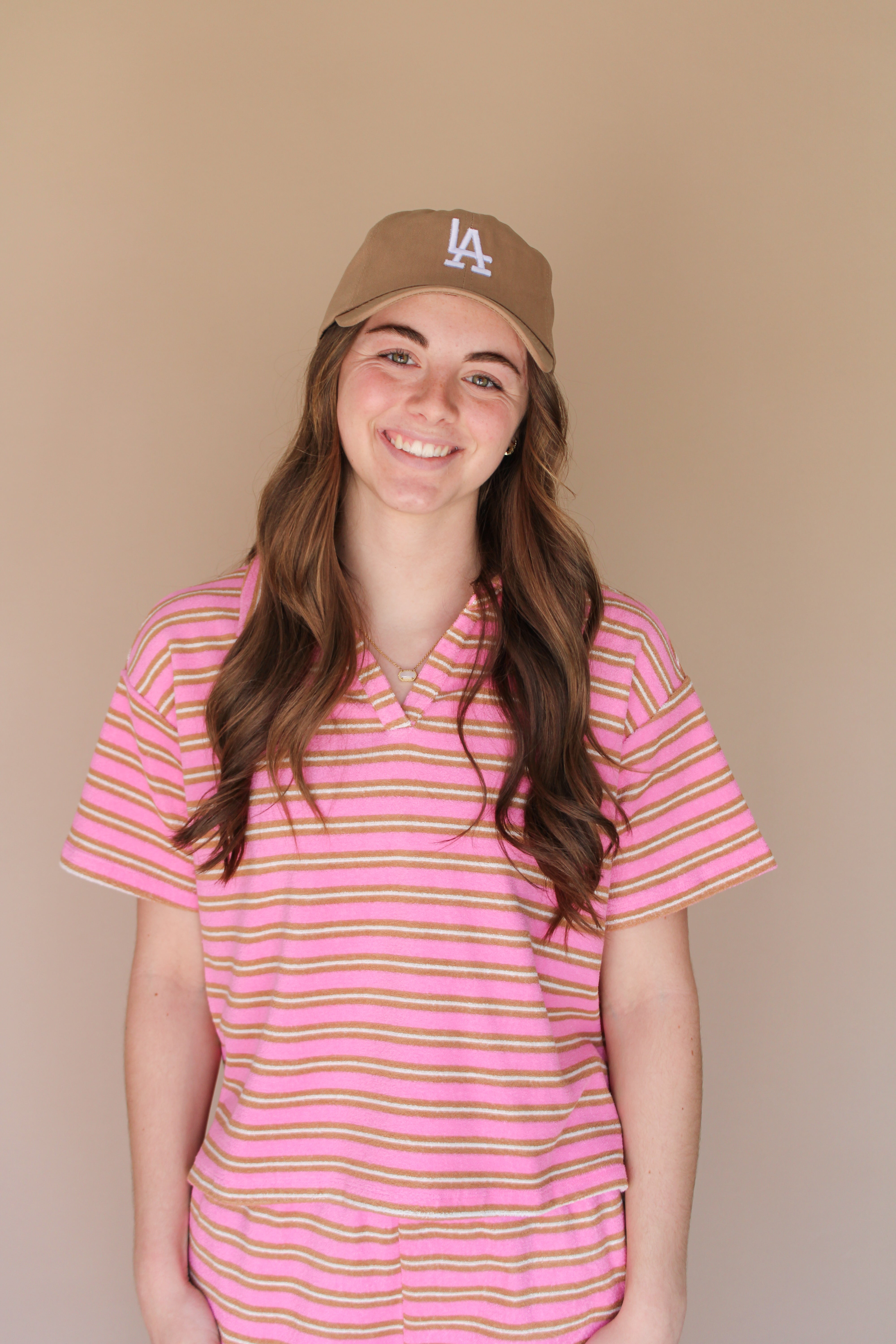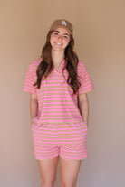 Effortlessly stylish, the TARYN STRIPED TERRY SET BY IVY & CO will have you looking cute and feeling comfortable. The striped terry knit top features a collared neckline and side slits, while the matching shorts have an elastic waistband and side pockets. Perfect for a casual day out or a cozy night in!