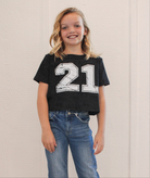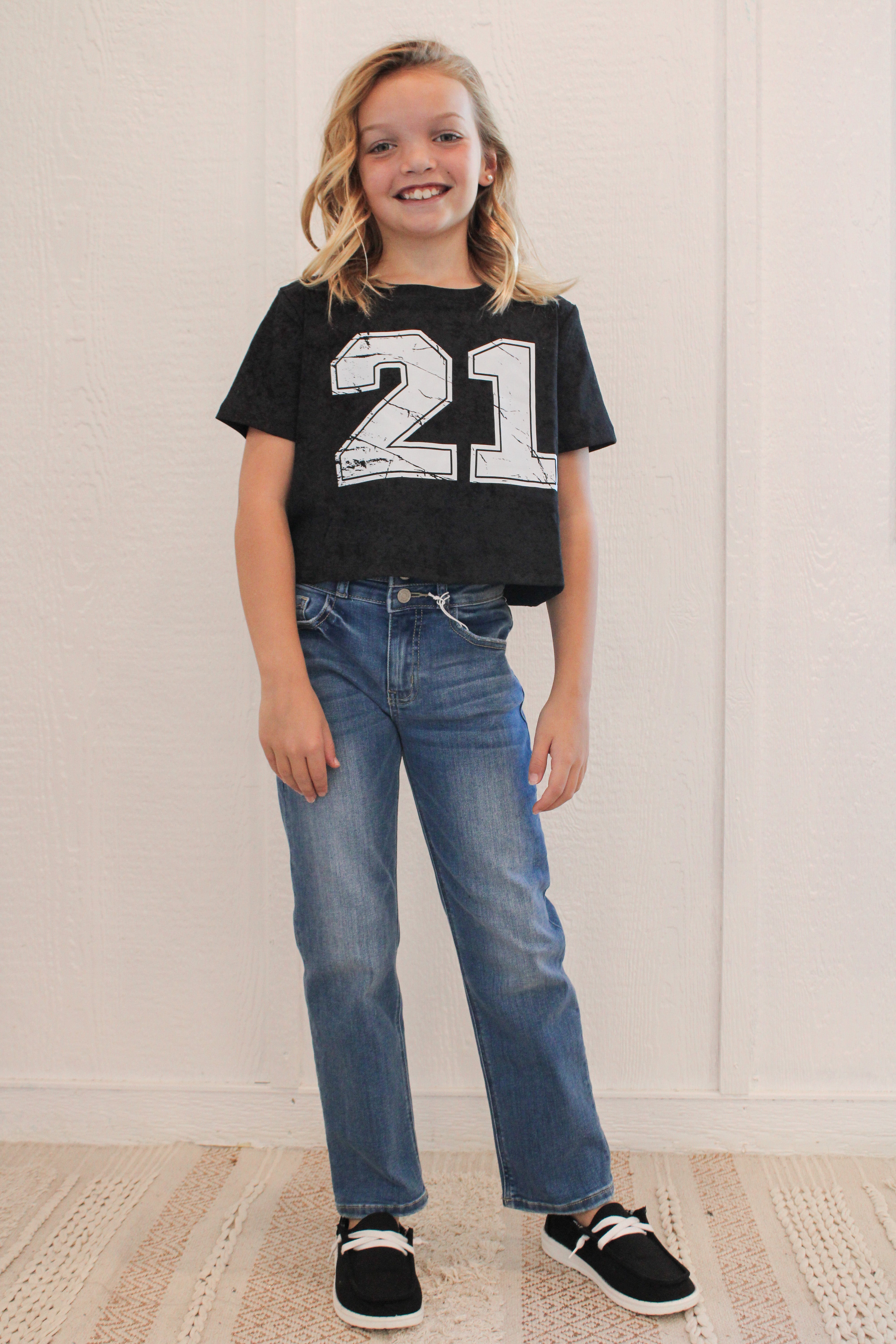 Introducing our Girls Distressed Print Washed Athletic Jersey Top! Made with washed knit fabric for ultimate comfort. The front graphic adds a unique touch, while the crop length keeps it stylish. Perfect for any sporty girl.