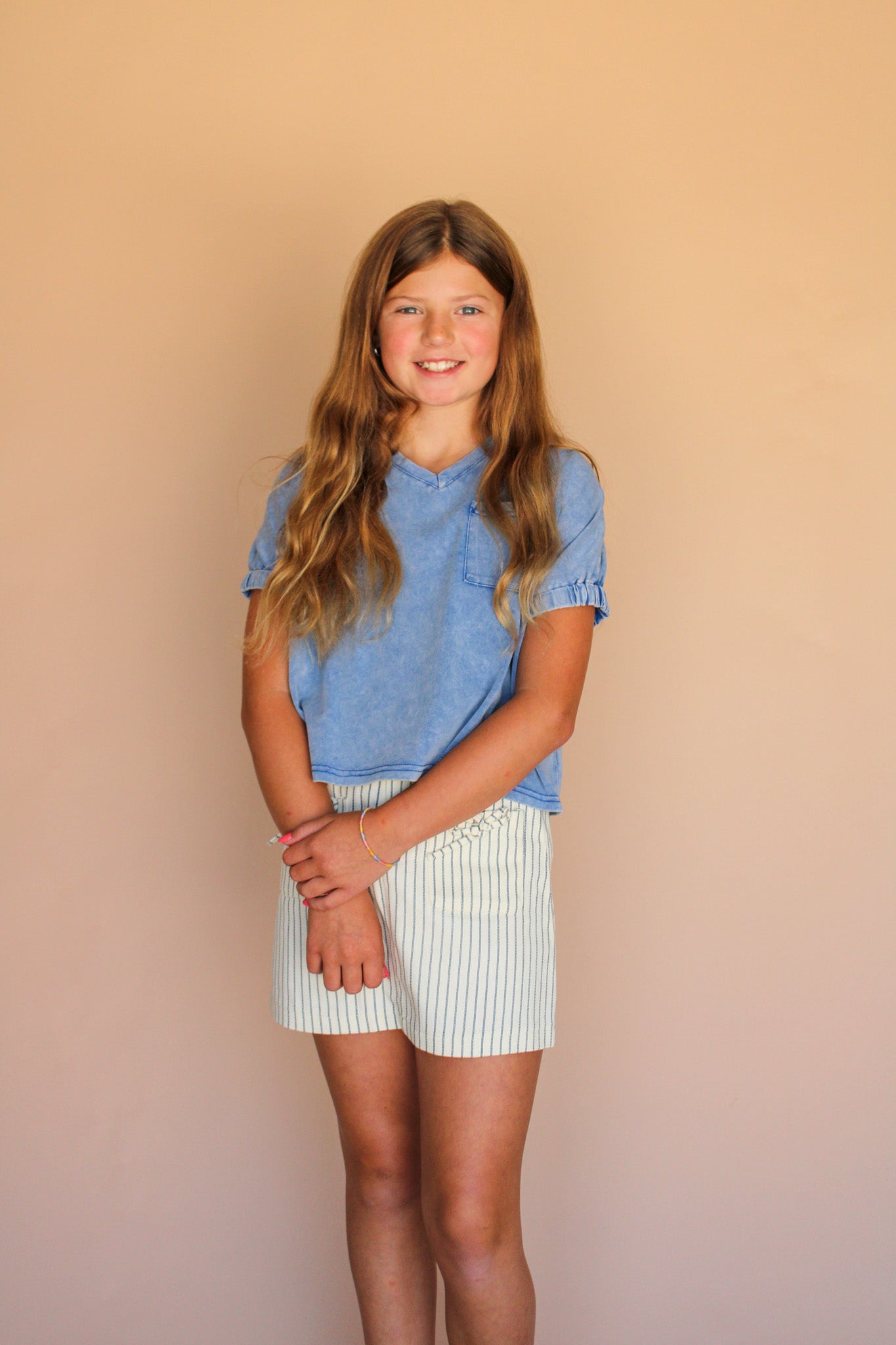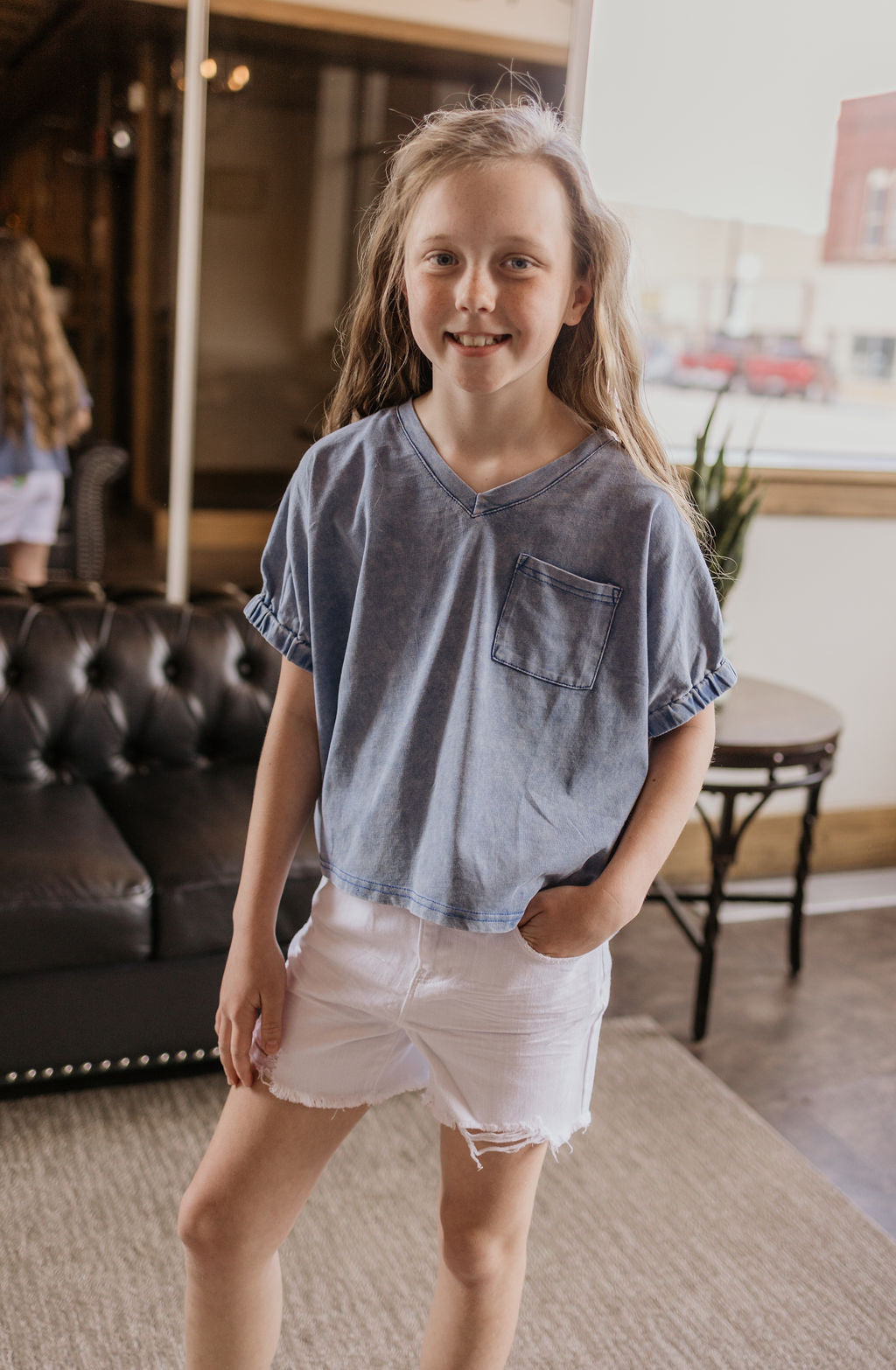 WREN GIRLS BLUE VNECK POCKET TEE WITH ELASTIC CUFF