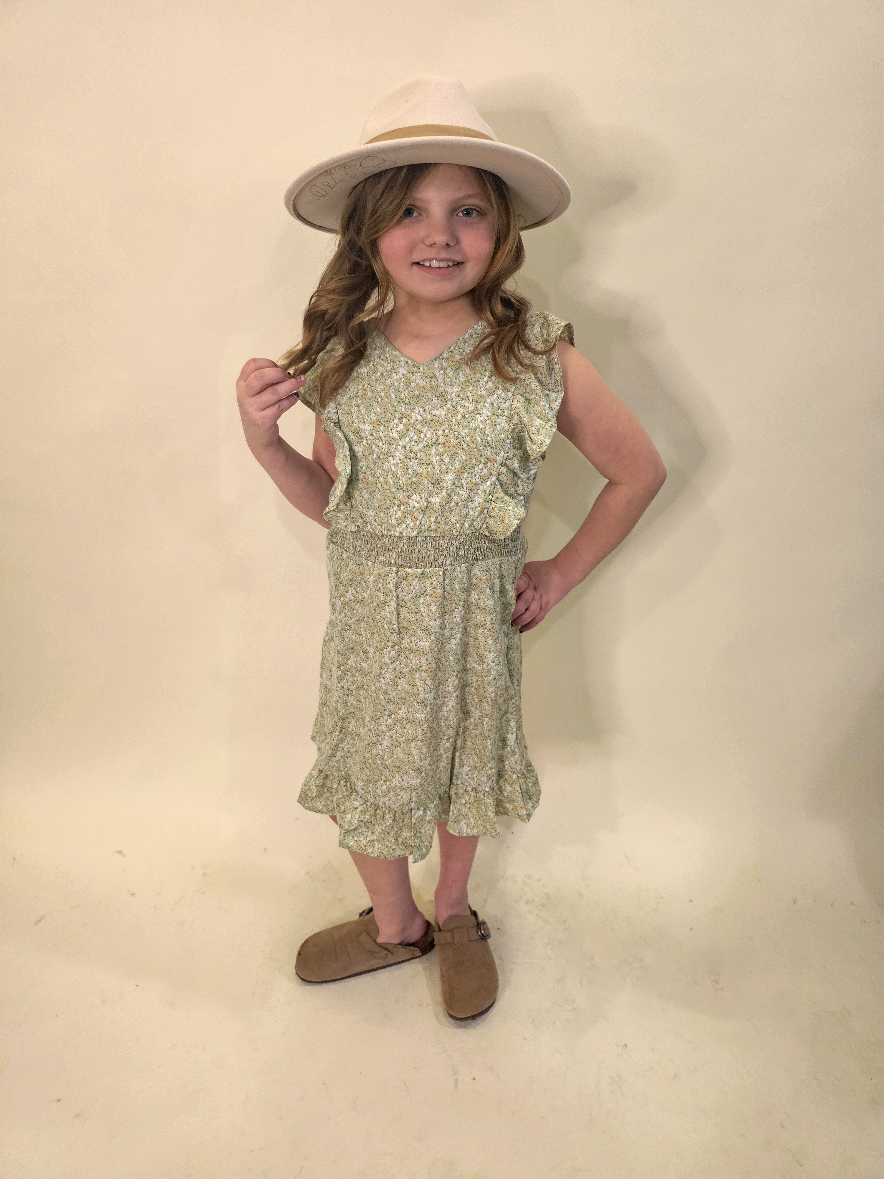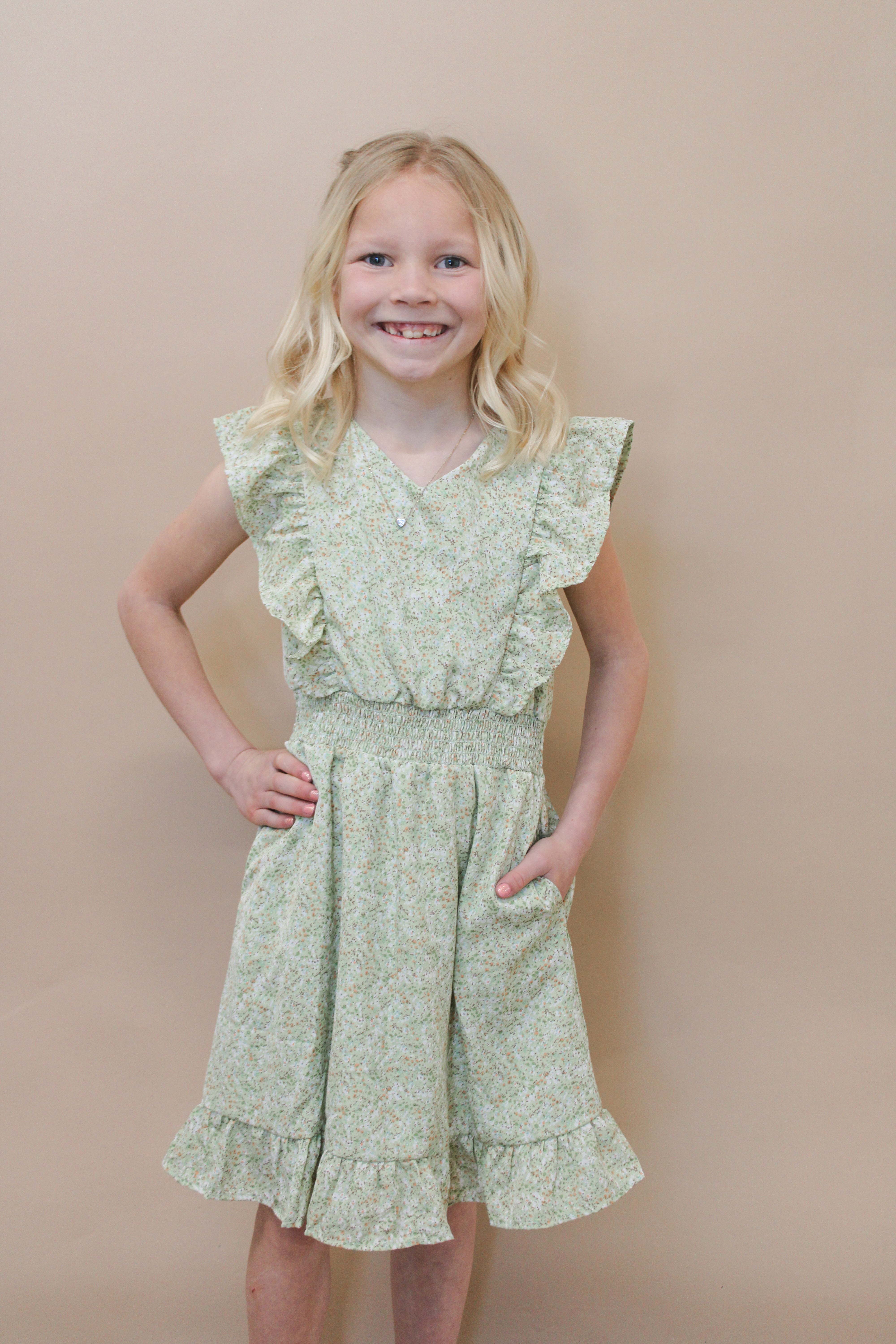 JAIMIE GIRLS FLORAL GREEN DRESS WITH RUFFLE SLEEVES