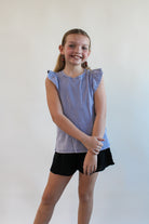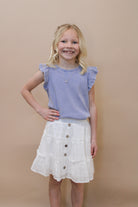 Introducing the Dayle Girls Ruffle Tank! Made from washed knit fabric, this tank boasts a fun round cut neckline and adorable flutter sleeves. Perfect for your little one's wardrobe, this tank is both playful and comfortable. Get ready for her to flutter into fashion!