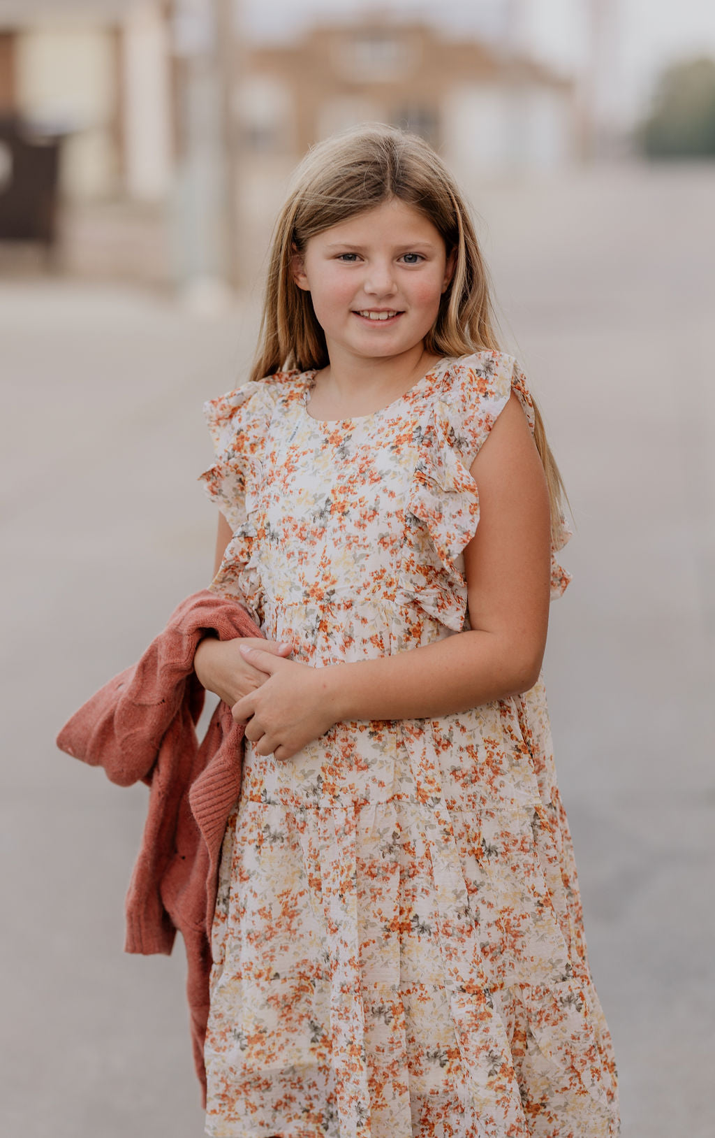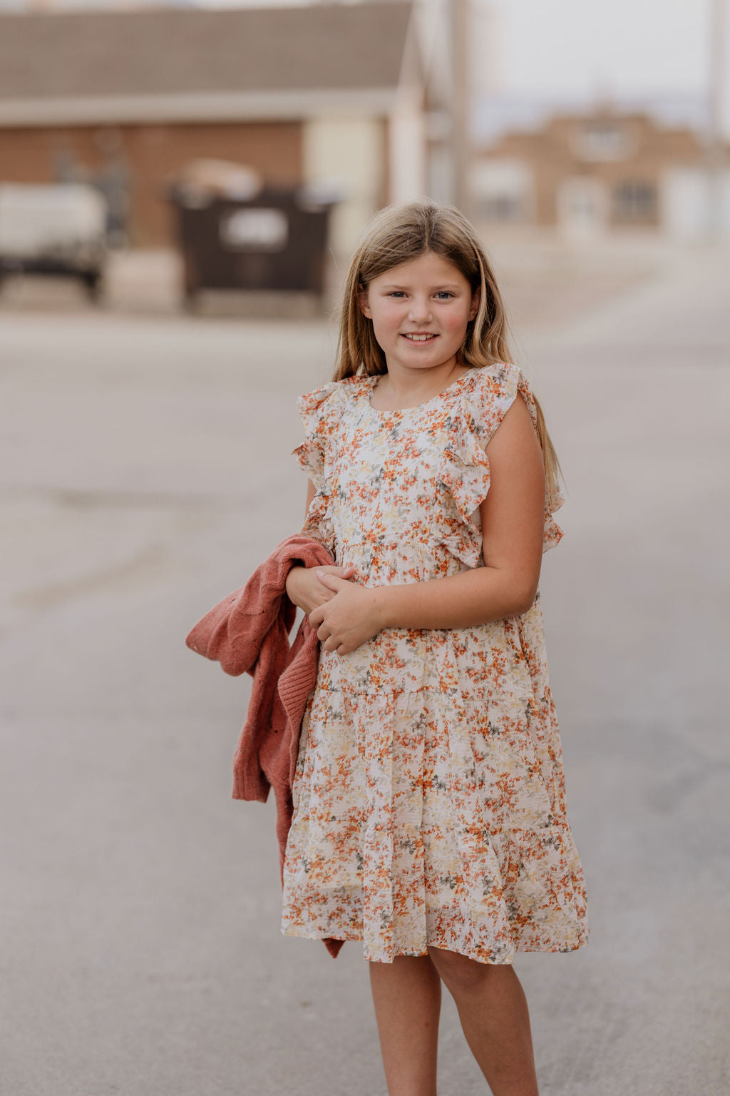 KENNEDY GIRLS RUST FLORAL RUFFLE TIERED DRESS