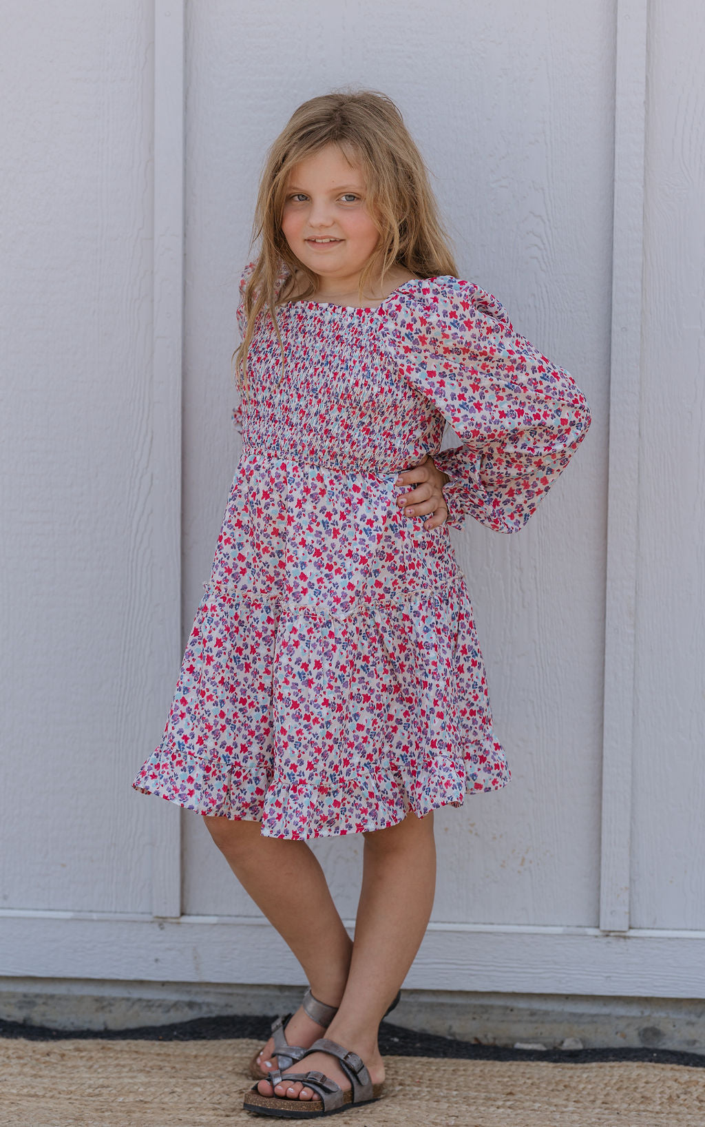 SHAY GIRLS PINK PURPLE AND BLUE FLORAL 3/4 SLEEVE DRESS