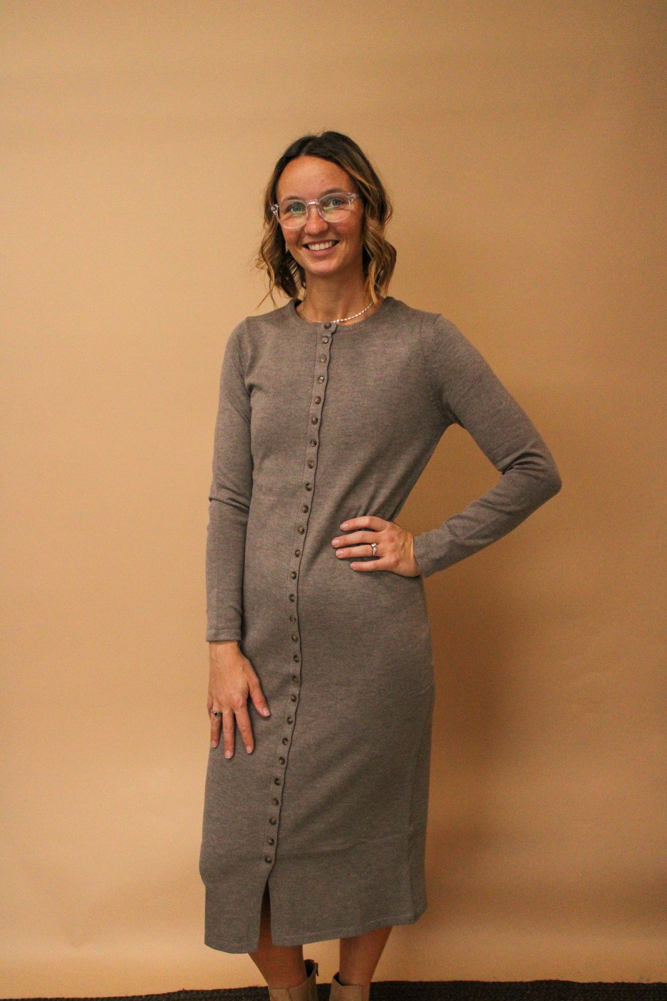Introducing the Dylan Button-Up Sweater Midi Dress—your new go-to for effortless style! This cozy midi features a mix of functional and decorative buttons down the front, giving you that charming, vintage-inspired look. The sweater knit keeps things warm and comfortable, while the midi length (47" in size Small) hits just right for a polished vibe. Dress it up with heels or keep it casual with sneakers—either way, you're serving pure sophistication with a playful twist.