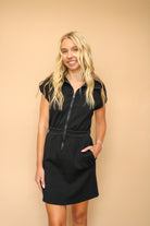 Slip into the ABBIE SPANDEX MINI DRESS and feel the silky smooth, lightweight fabric hug your curves just right. With playful short sleeves, a handy side pocket, and a chic half zip-up front, this dress blends fun and function effortlessly. The seaming details add a flirty touch, making it your go-to for stylish everyday adventures.