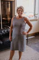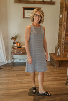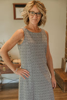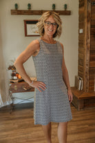 Be the center of attention in the AMORY SLEEVELESS ABSTRACT DRESS! This stunning sleeveless dress features a round neck design and eye-catching black and white abstract print. Perfect for any occasion, this dress will make you stand out in style.