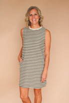 Step into playful comfort with the Melinda Sleeveless Swing Dress. Featuring a charming cream and olive stripe pattern, this crewneck dress is perfect for effortless layering. The sleeveless design keeps it breezy, while handy side pockets add a splash of practicality. Whether you're out for a casual day or dressing up with layers, this swing dress moves with you in style and ease.
