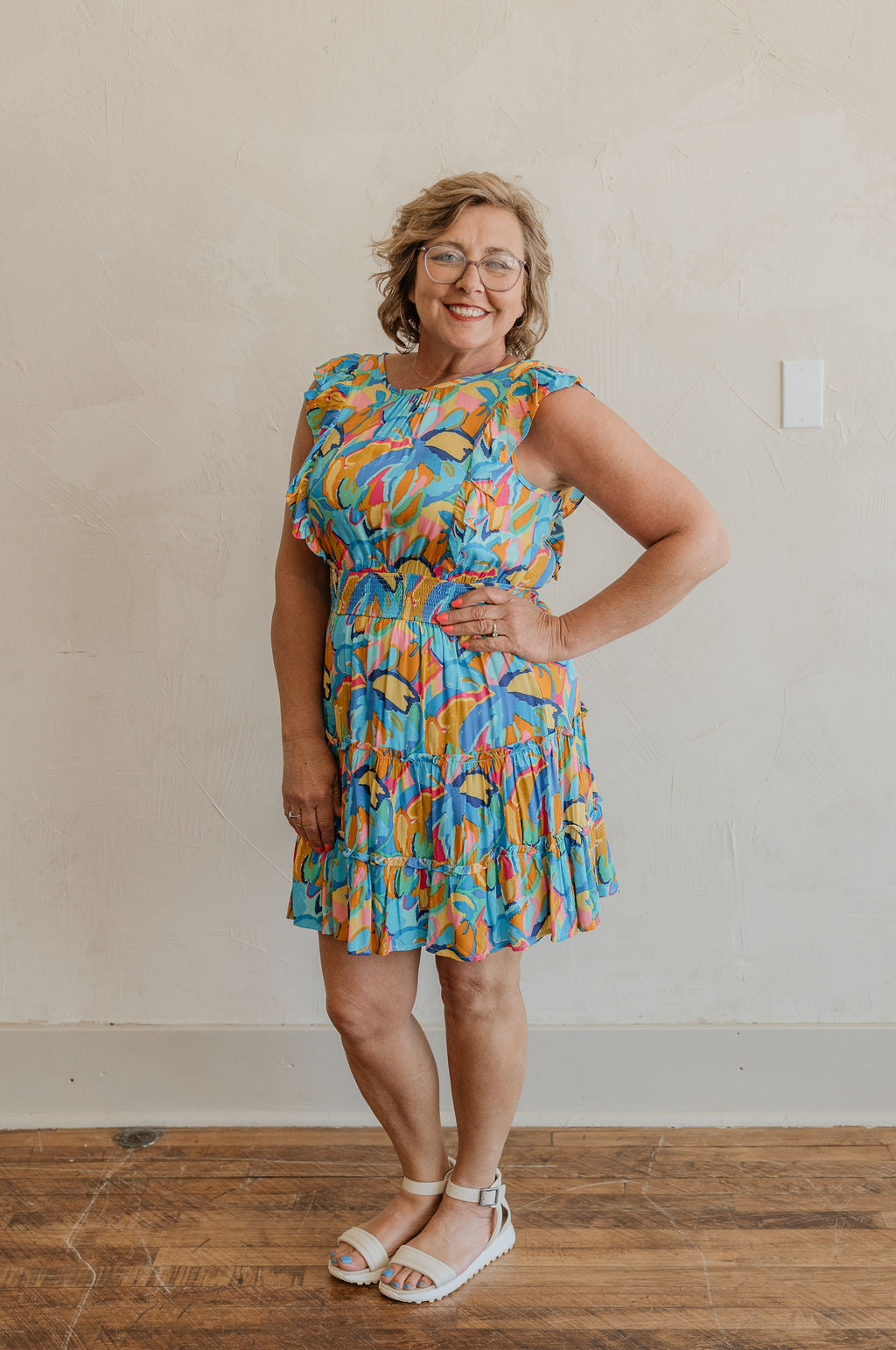 GRETA ABSTRACT PRINT SHORT RUFFLE SLEEVE SHORT DRESS