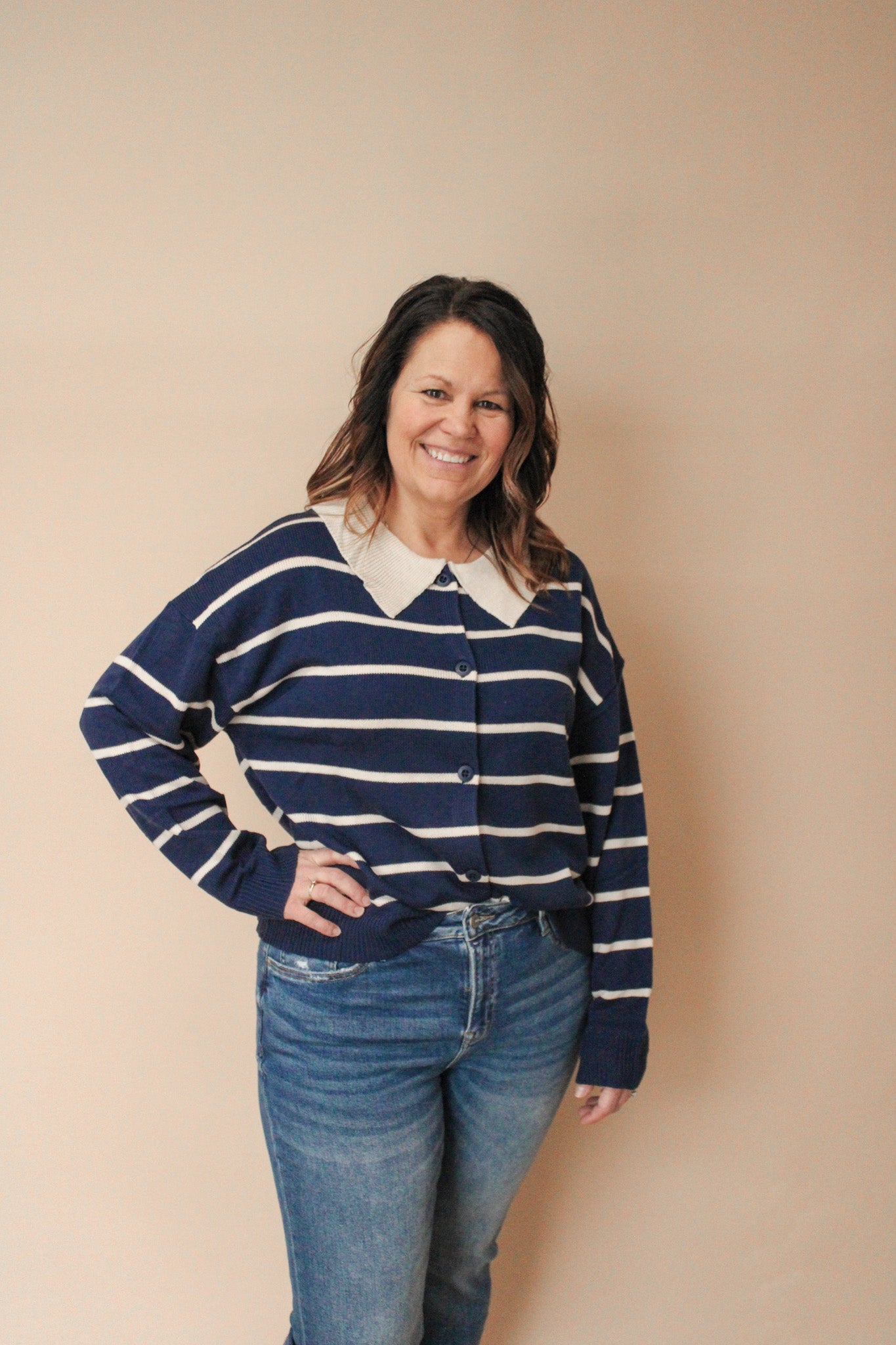 Effortlessly cool meets cozy comfort with this oversized button-down striped sweater. Rock the relaxed drop shoulder silhouette and collared neckline for that perfectly put-together vibe, while long sleeves and ribbed hems keep things polished. Layer it, button it up, or wear it open—this casual essential works overtime in your wardrobe rotation.