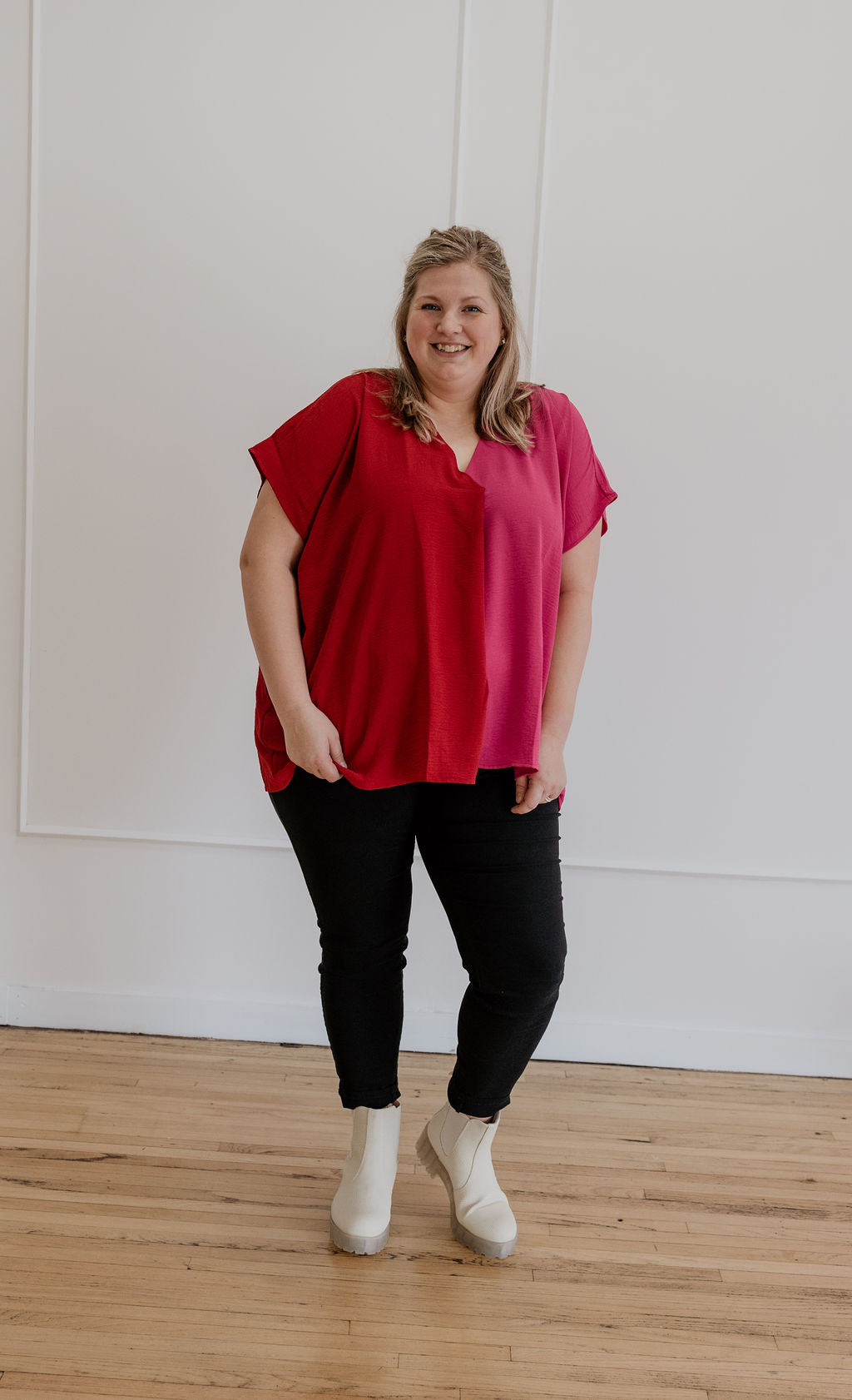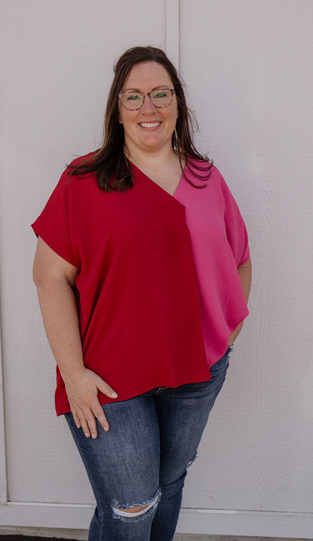 RUBIE COLORBLOCK CURVY BLOUSE PINK & RED