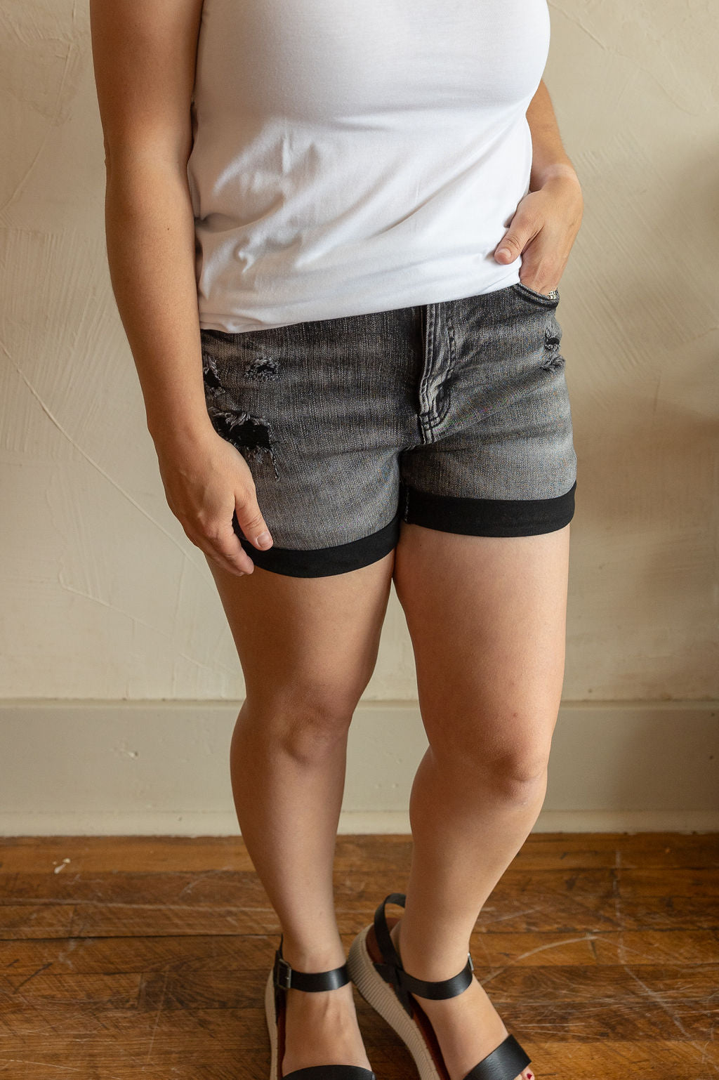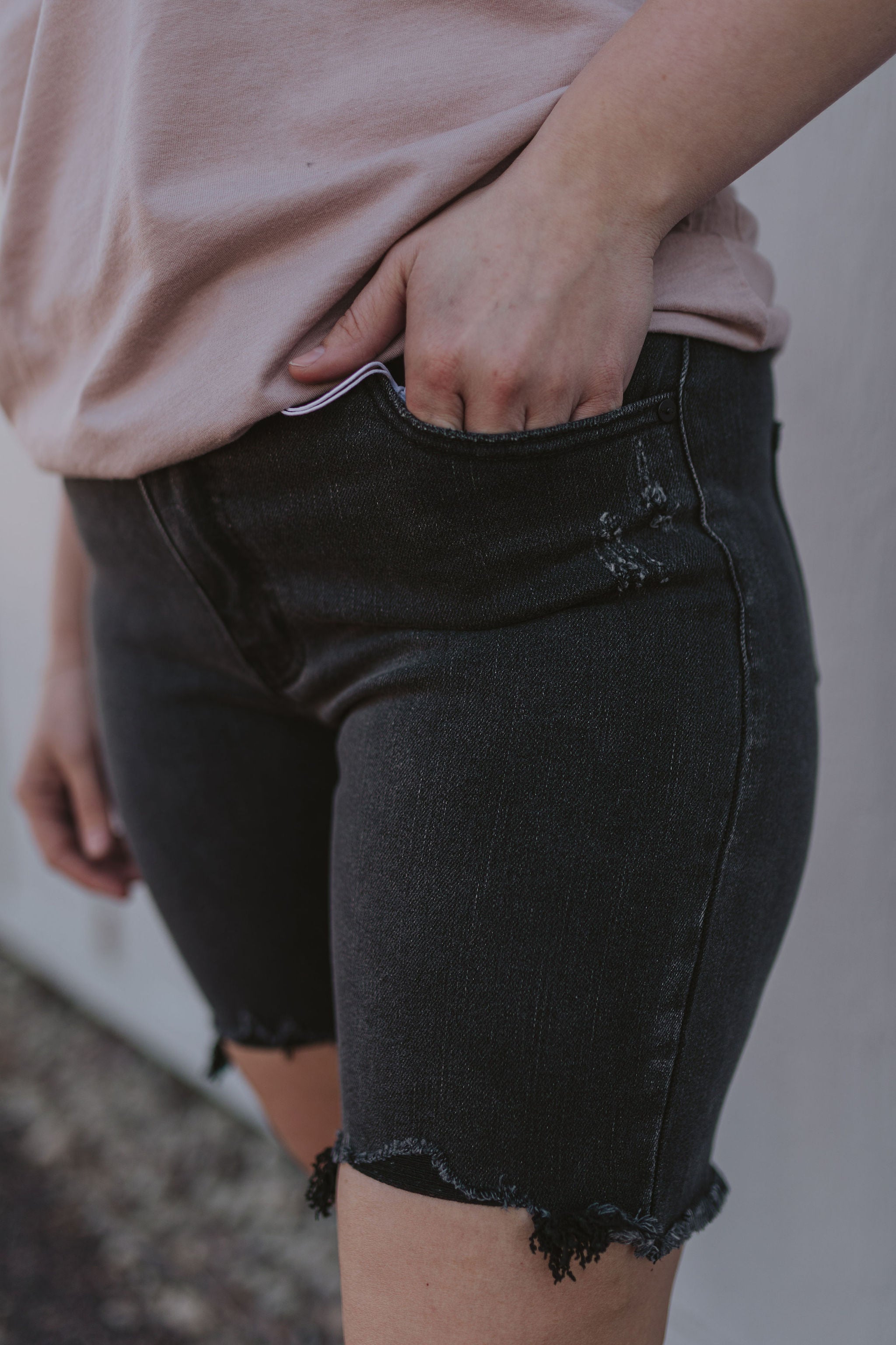 BLACK HIGH RISE ROLLED UP DENIM SHORTS