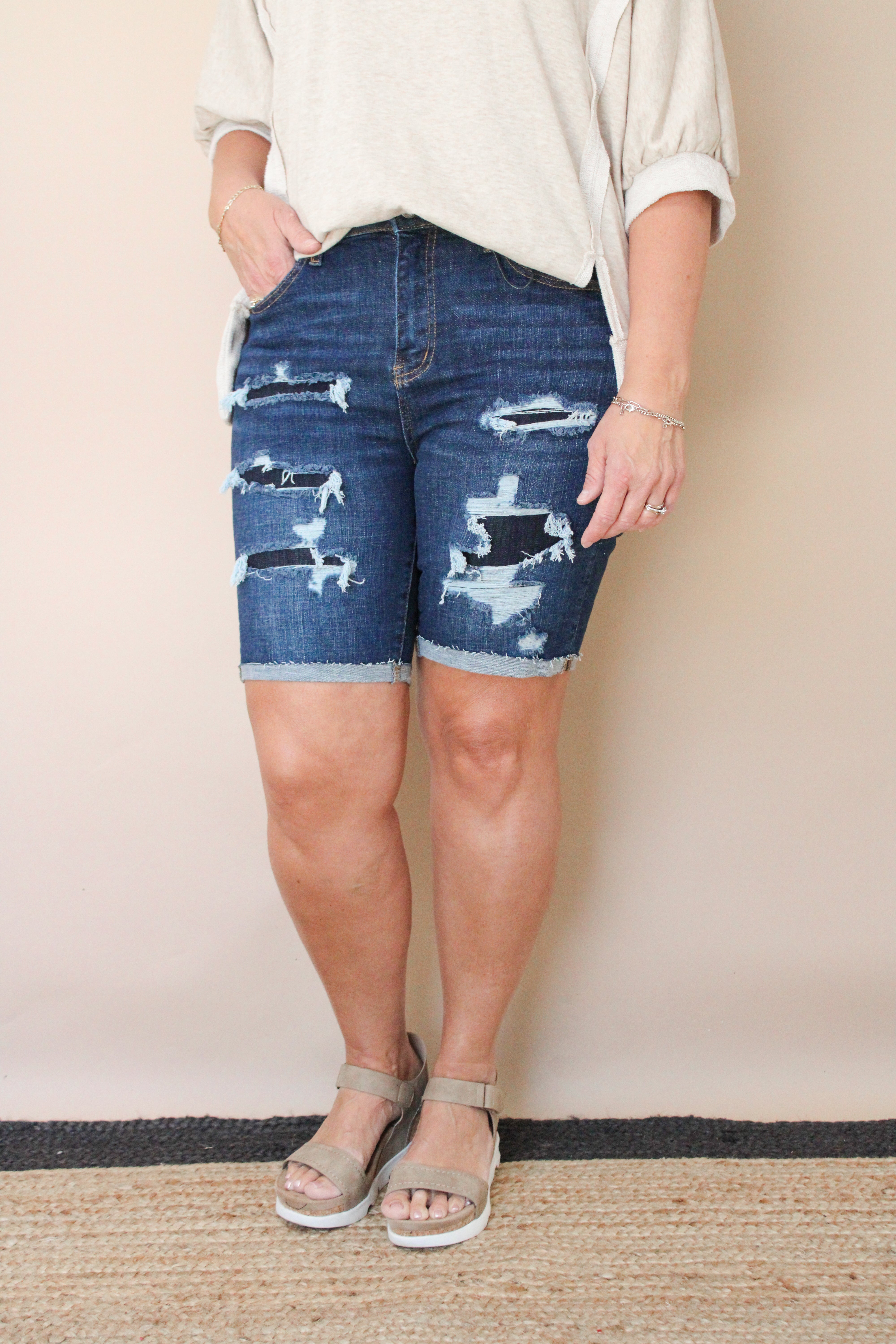 GRACE HIGH RISE PATCHED BERMUDA JEAN SHORTS