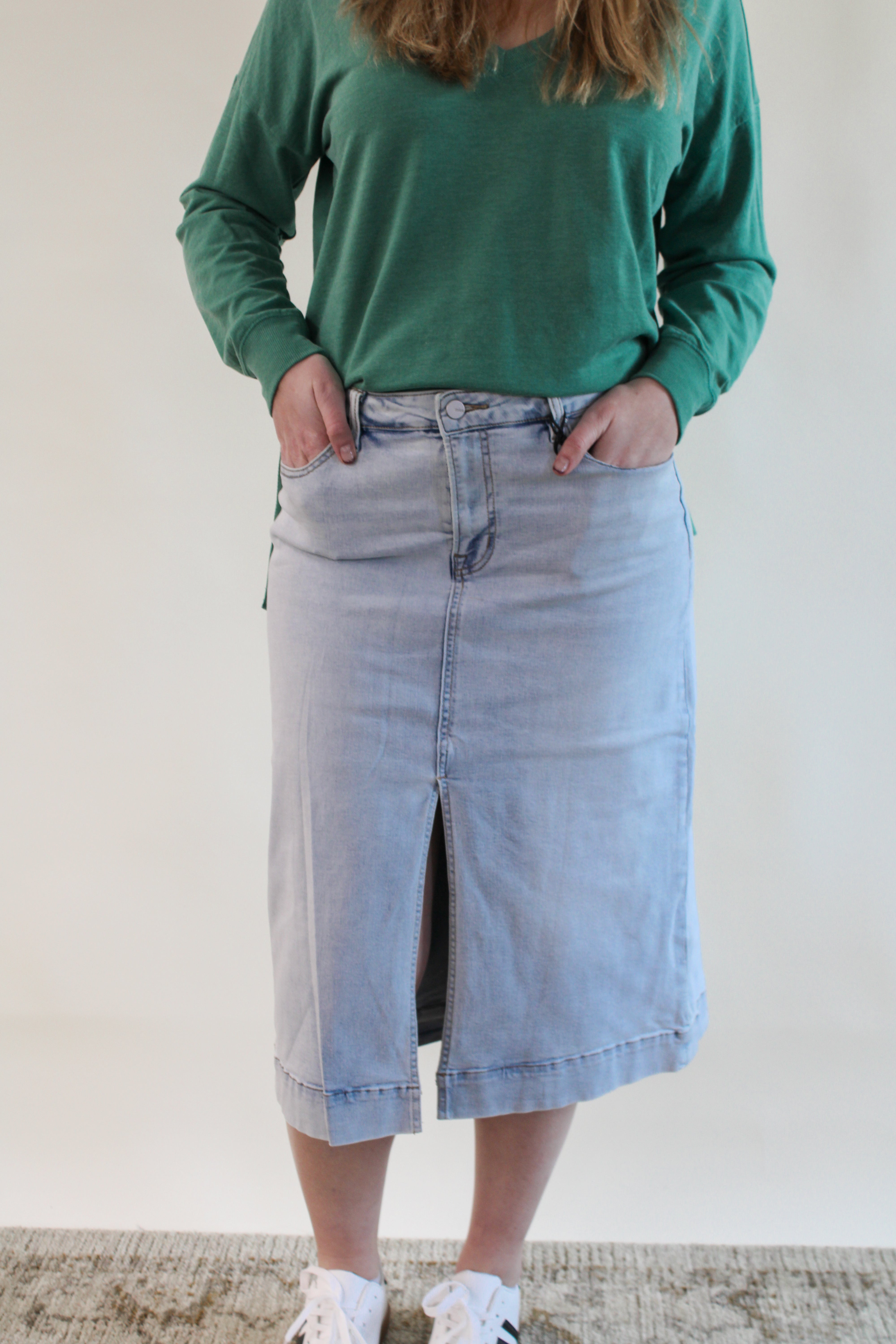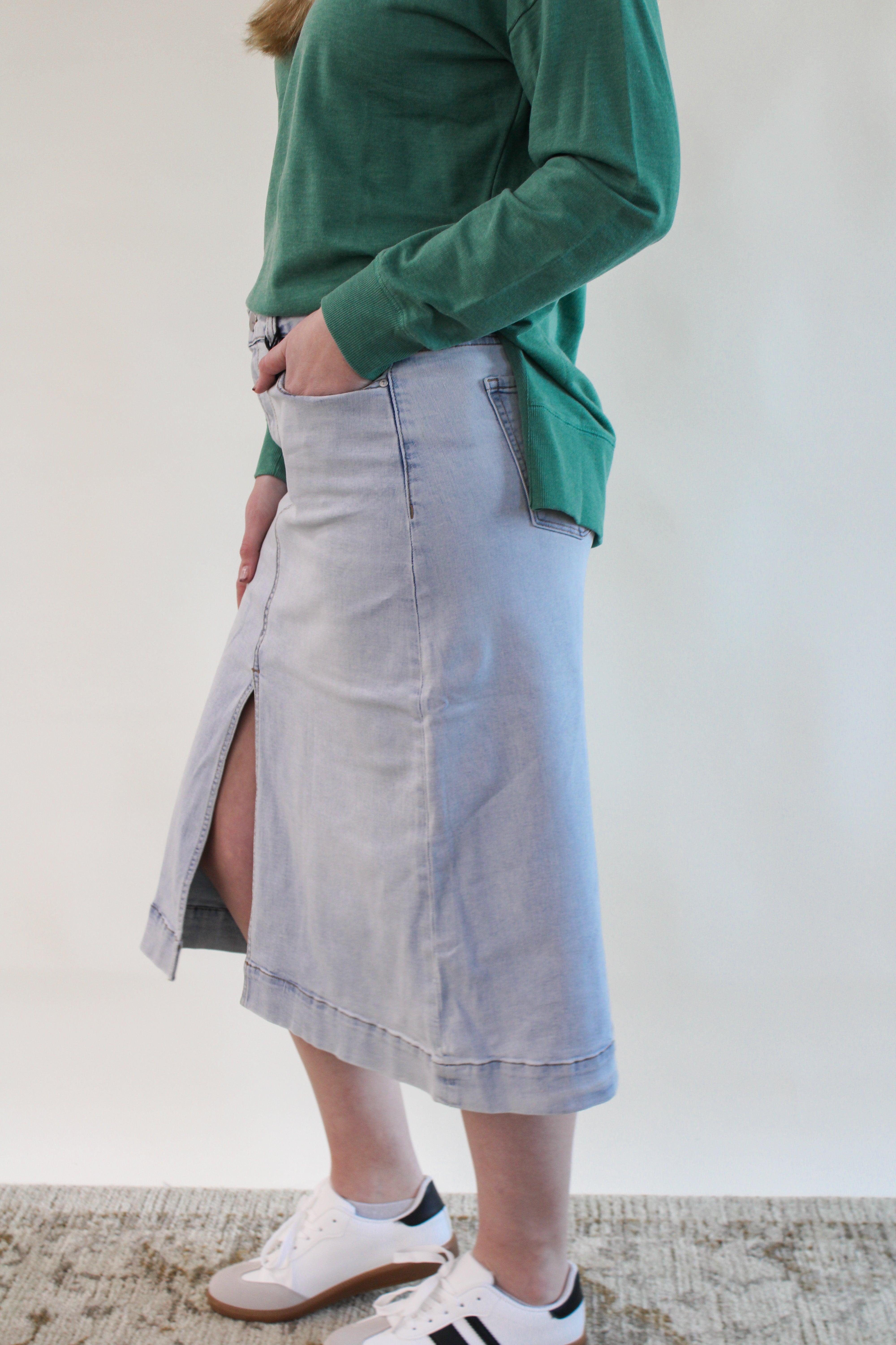 AINSLEY REG/CURVY HIGH-RISE FRONT SLIT DENIM SKIRT