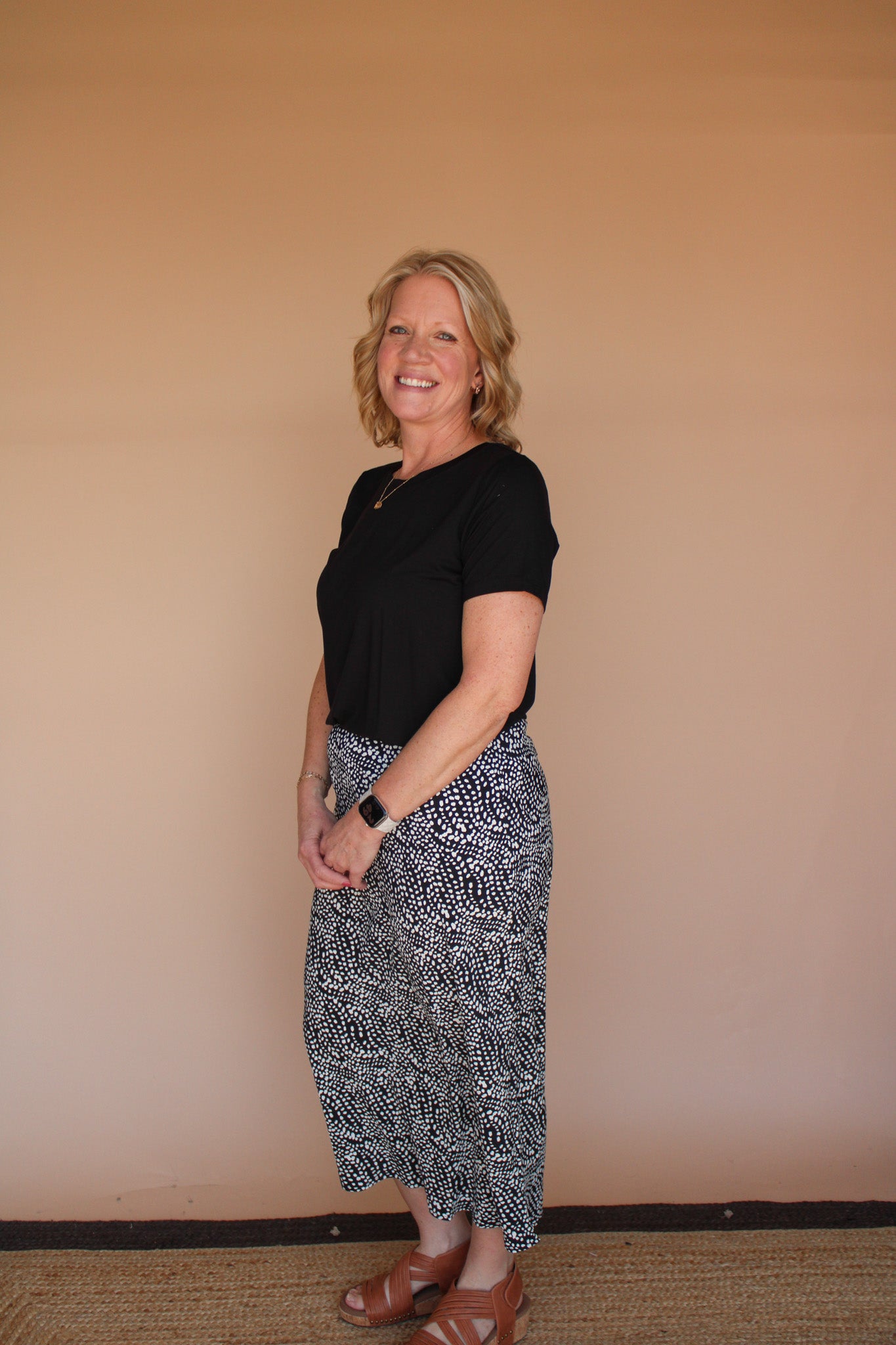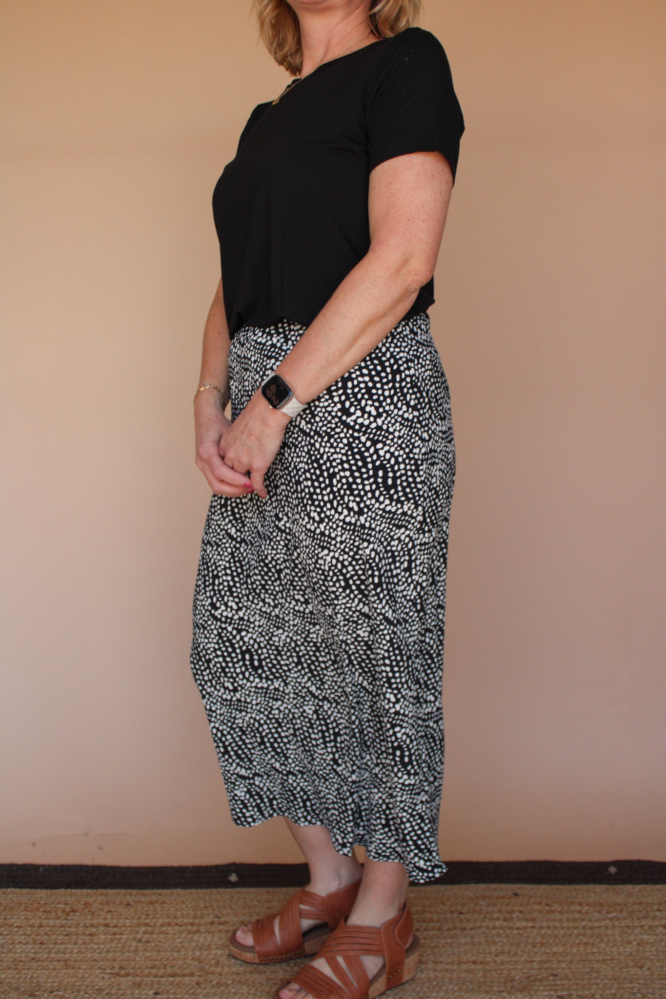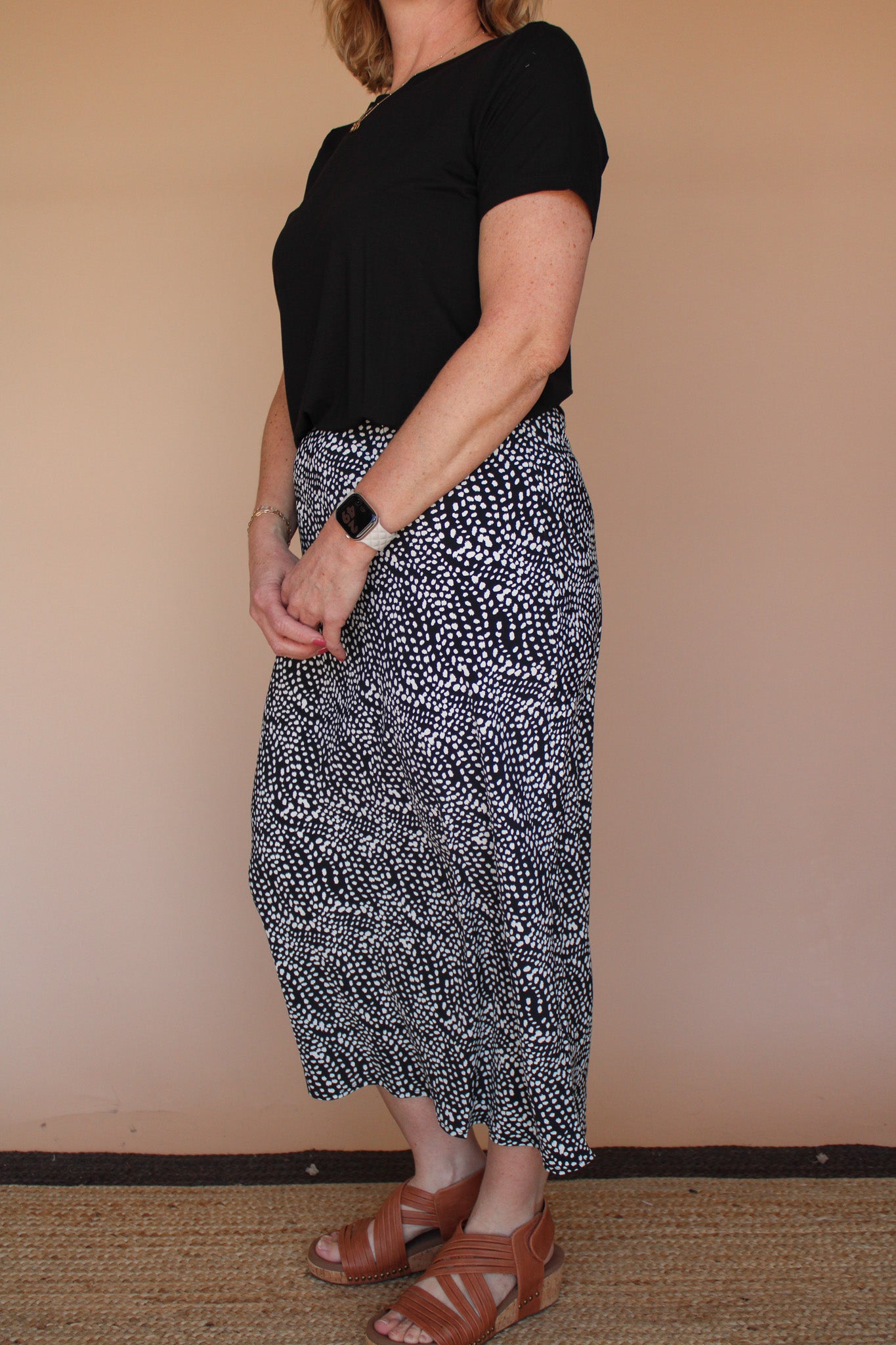 The June Midi Skirt features a charming black dot print that effortlessly transitions from day to night. Designed with a comfortable elastic waistband, this stretch-fit skirt adapts to your body for all-day ease and movement. The midi length offers a versatile, flattering silhouette perfect for any occasion. Whether you're dressing up or keeping it casual, this print skirt delivers style without compromise.