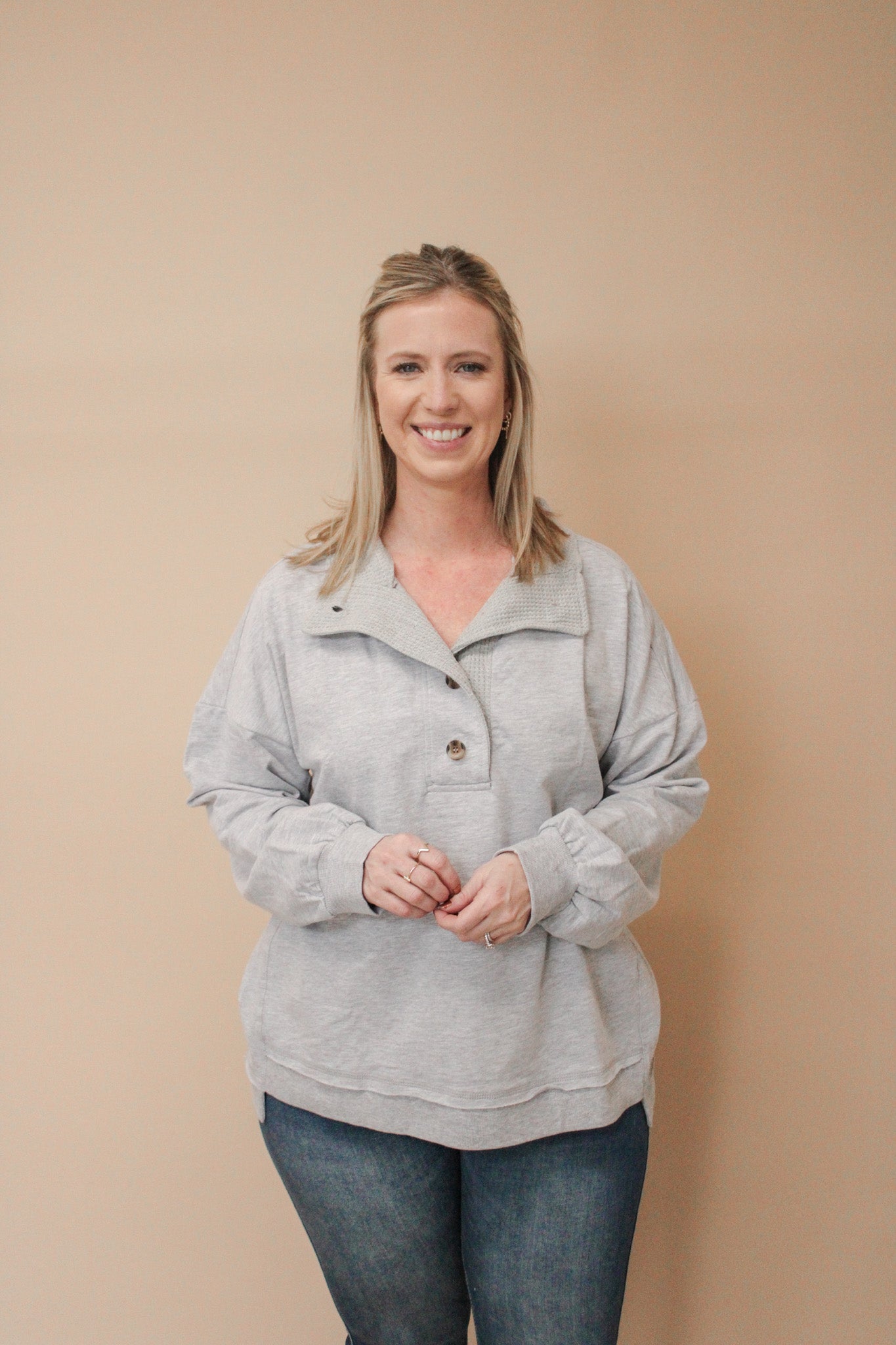 Effortlessly chic meets cozy comfort with the Haiden Mineral Washed Casual Top. This oversized beauty features a relaxed drop shoulder silhouette and half button-down front for easy layering and styling versatility. Crafted from soft French terry knit with a trendy mineral wash finish, it's the perfect casual piece that works as hard as you do. Long sleeves and a mock neck complete this laid-back look that's ready for coffee runs, weekend hangouts, or just vibing at home.