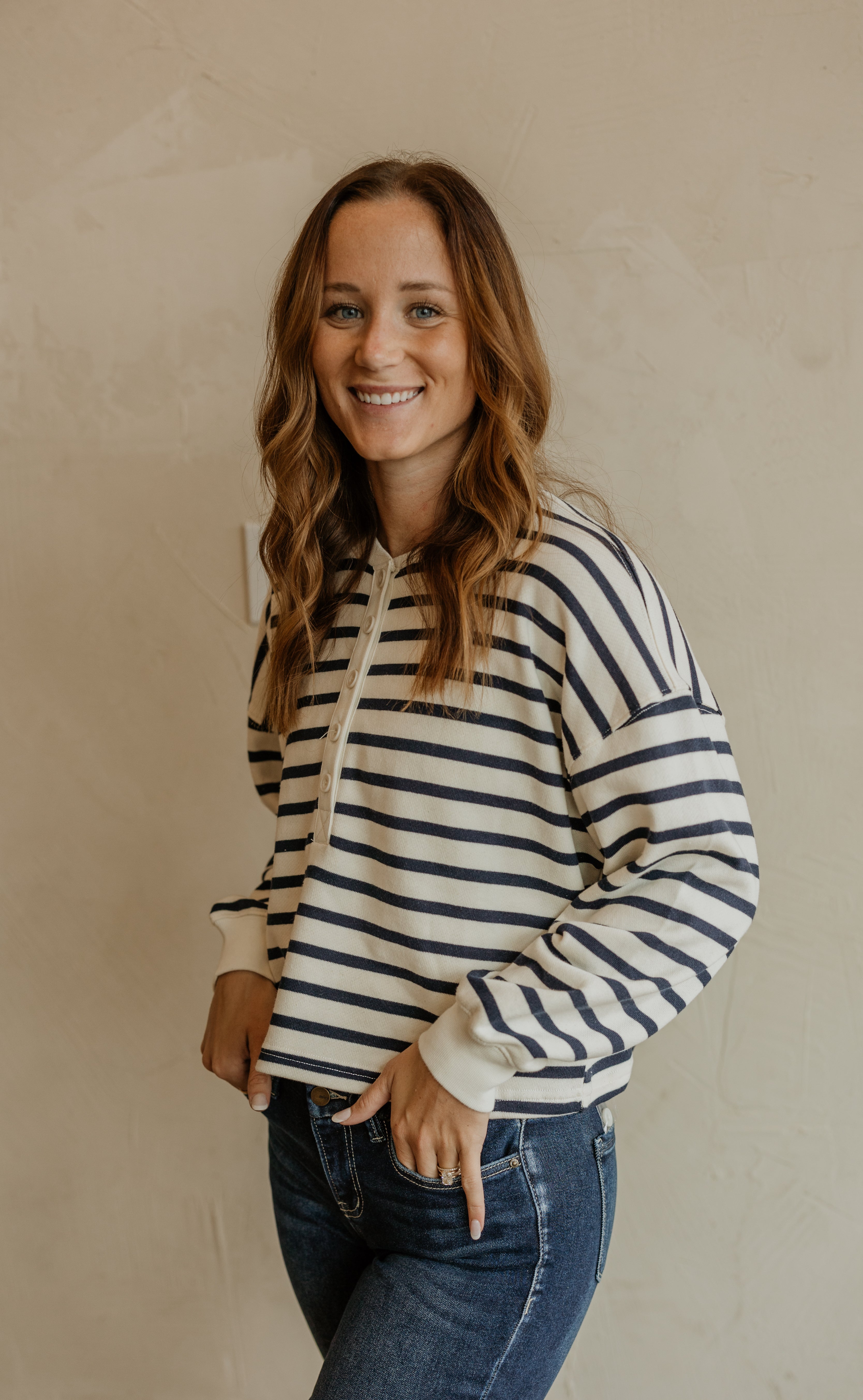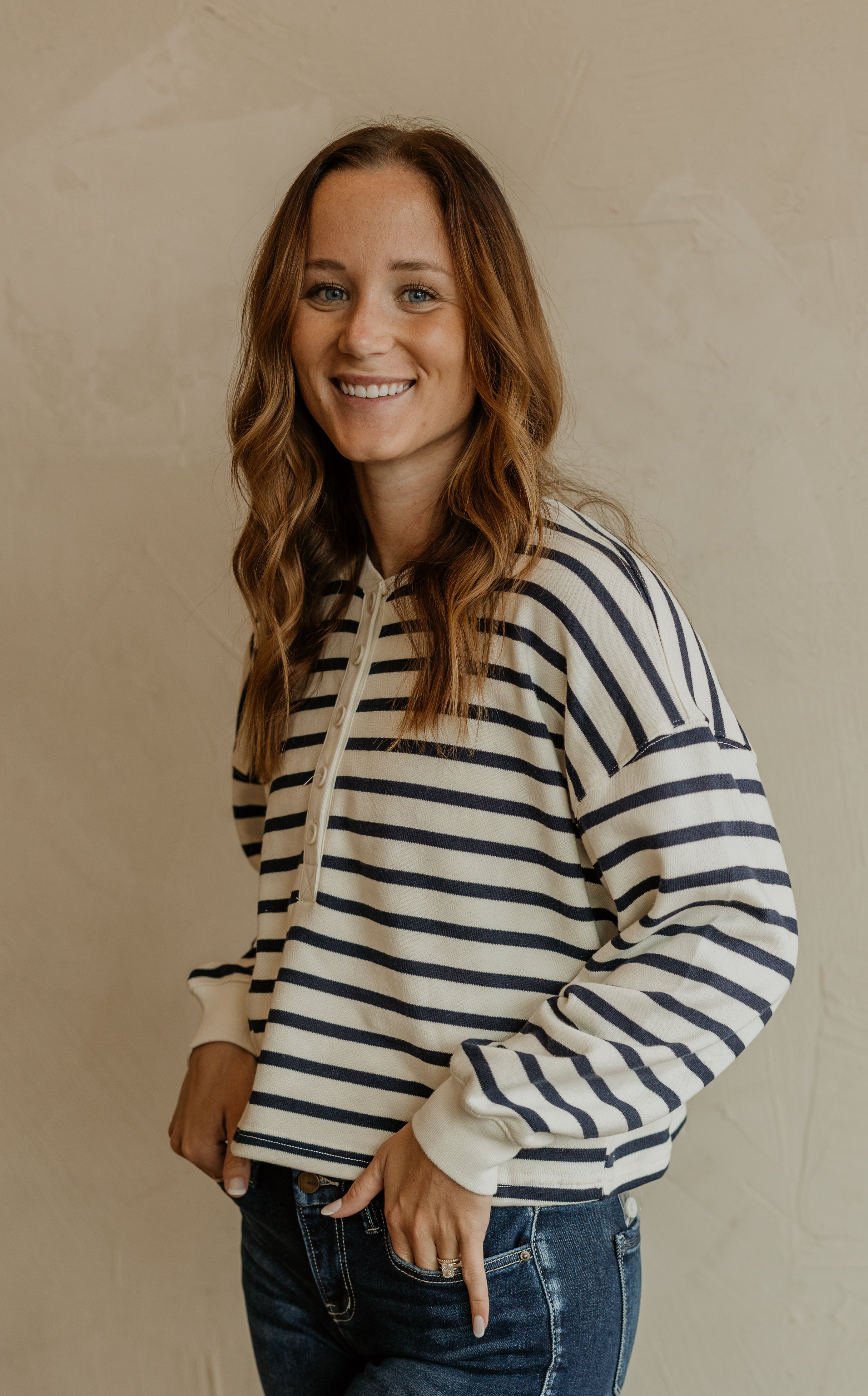 TERRY STRIPED HALF BUTTON PULLOVER
