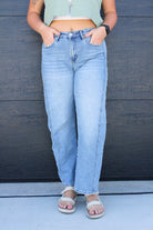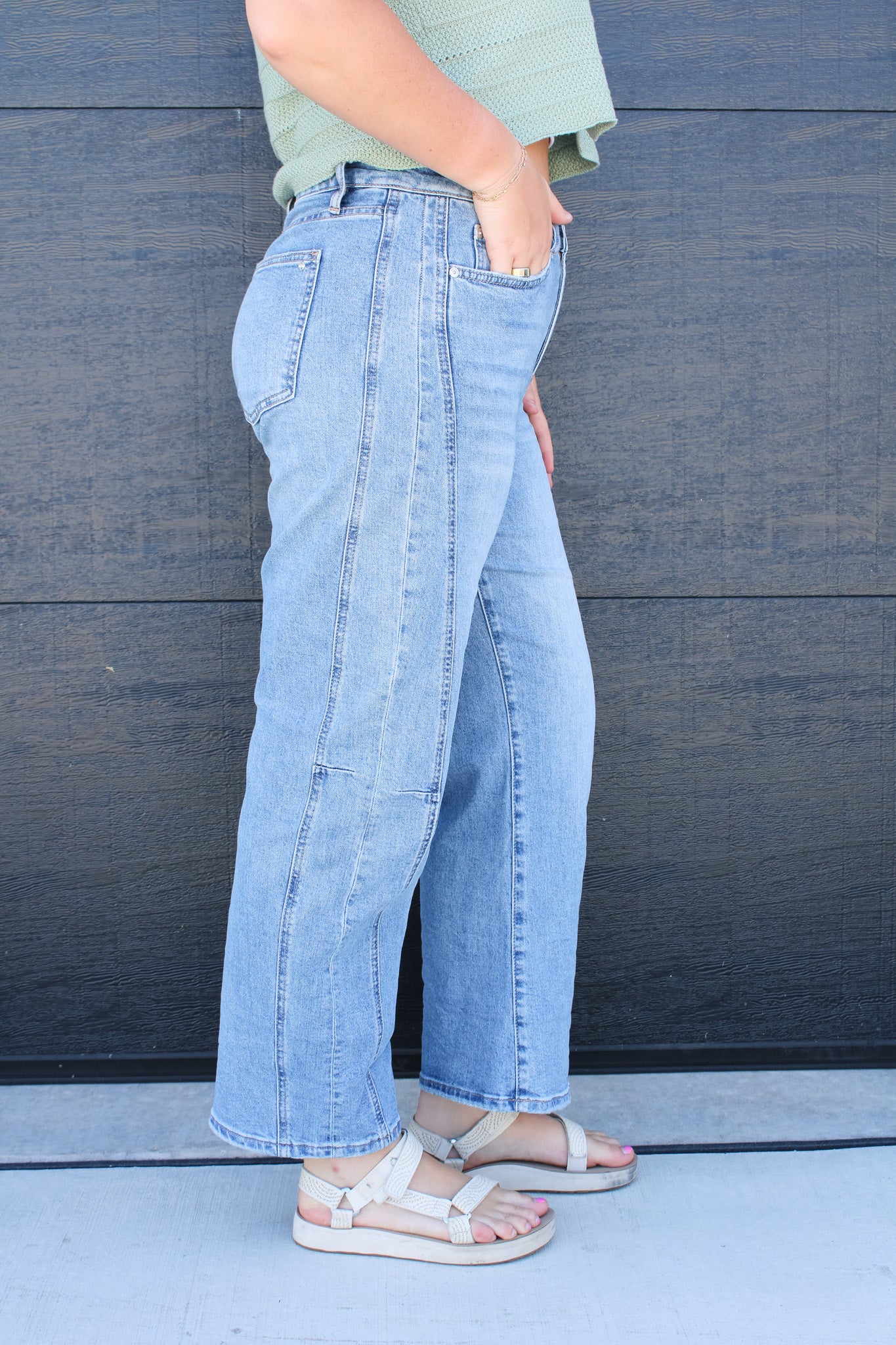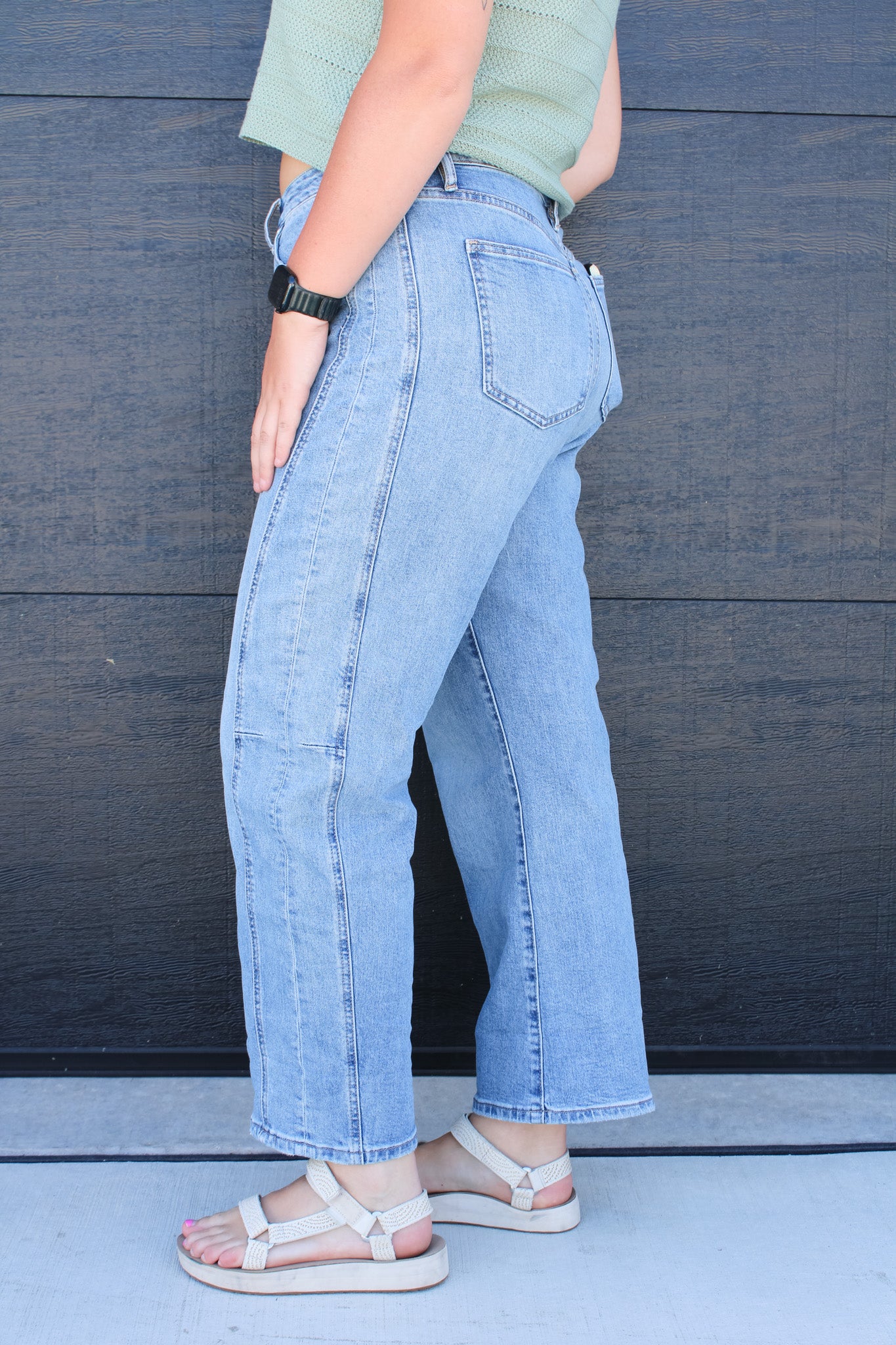 These Addison High Rise Barrel-Leg Cuffed Jeans blend comfort and style with a soft 94% cotton fabric, plus a touch of polyester and spandex for the perfect fit. The high-rise design with a 10 3/4" front rise flatters your waist, while the barrel-leg cut and cuffed hems add a fun, retro vibe to your look. Perfect for turning heads and feeling fabulous all day long!