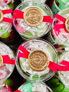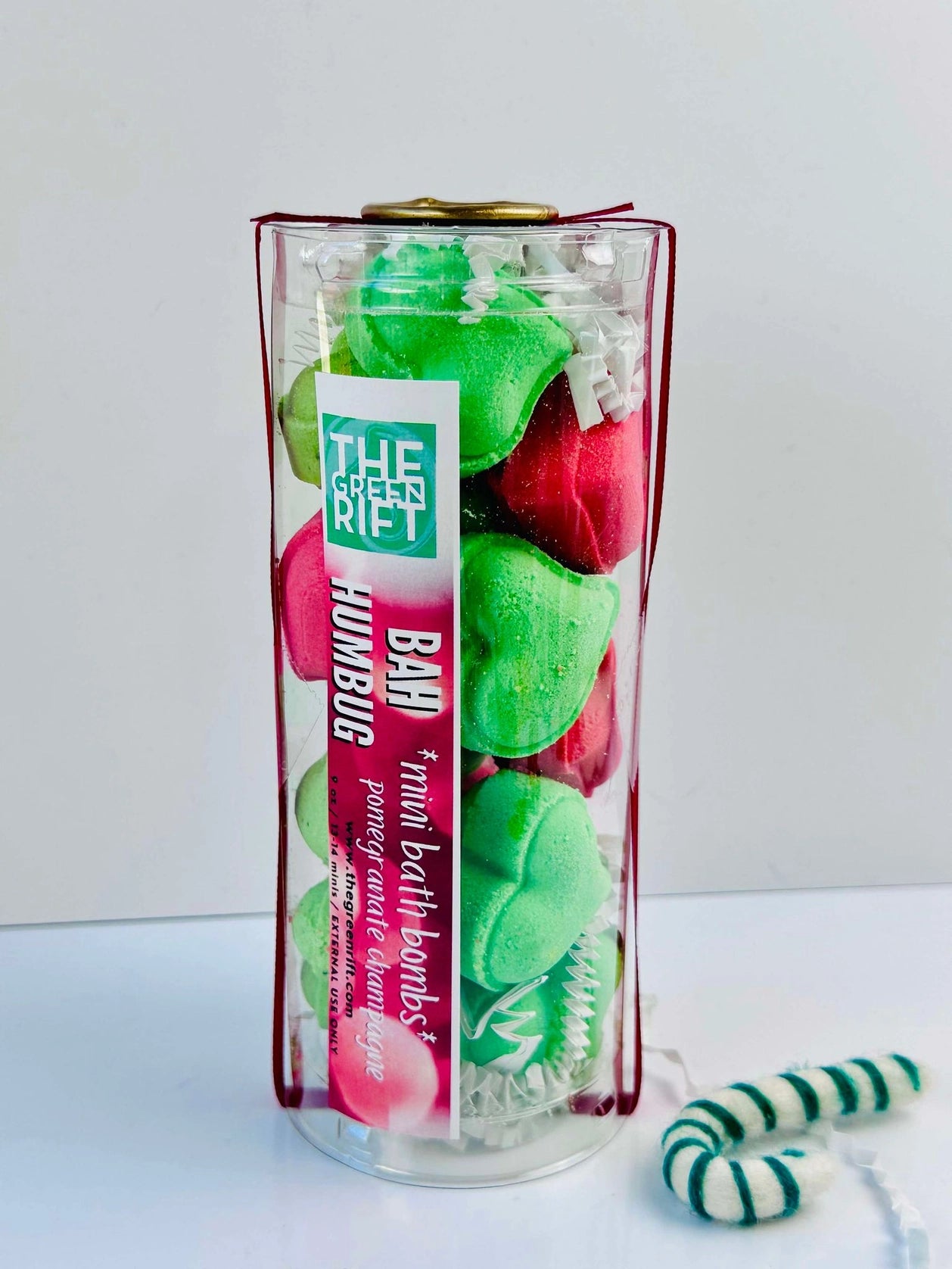 Fun stocking stuffers for even the 'grinch'est' on your holiday list this season. Enjoy creamy bubbles, skin softening notions of avocado oil and cocoa butter jammed packed into a mini bath bomb for you to enjoy with our ode to 'Mr Green Man' himself. 13-14 mini bath bombs, assortment of red & green, packaged in a clear tube with a piece of ribbon wrapped around & topped with a gold North Pole wax seal.