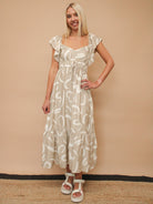 Get ready to turn heads in the Bella Printed Front Tie Midi Dress! Featuring a flattering sweetheart neckline, flutter sleeves, and shirred waist for a perfect A-line fit. The playful graphic line print adds a touch of quirkiness to this lined midi dress, while the front self tie and elastic waist ensure comfort and style all day long. Made with soft and lightweight fabric, this dress is perfect for any occasion. Don't miss out on this must-have addition to your wardrobe!