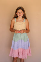 Get ready to dance in the rain with our Carsyn Rainbow Tiered Dress! Featuring a colorful, wavy tiered skirt and playful button details, this dress is made with a colorblock woven fabric and smocked detail for ultimate comfort. Brighten up any day with this fun and stylish dress.
