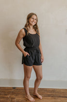 The romper is sleeveless with wide shoulder straps and a scoop neckline. It has an elastic waistband with a drawstring tie at the front, providing a comfortable and slightly cinched fit. The bottom half consists of loose-fitting shorts with side pockets. The fabric appears lightweight and casual, suitable for warm weather.