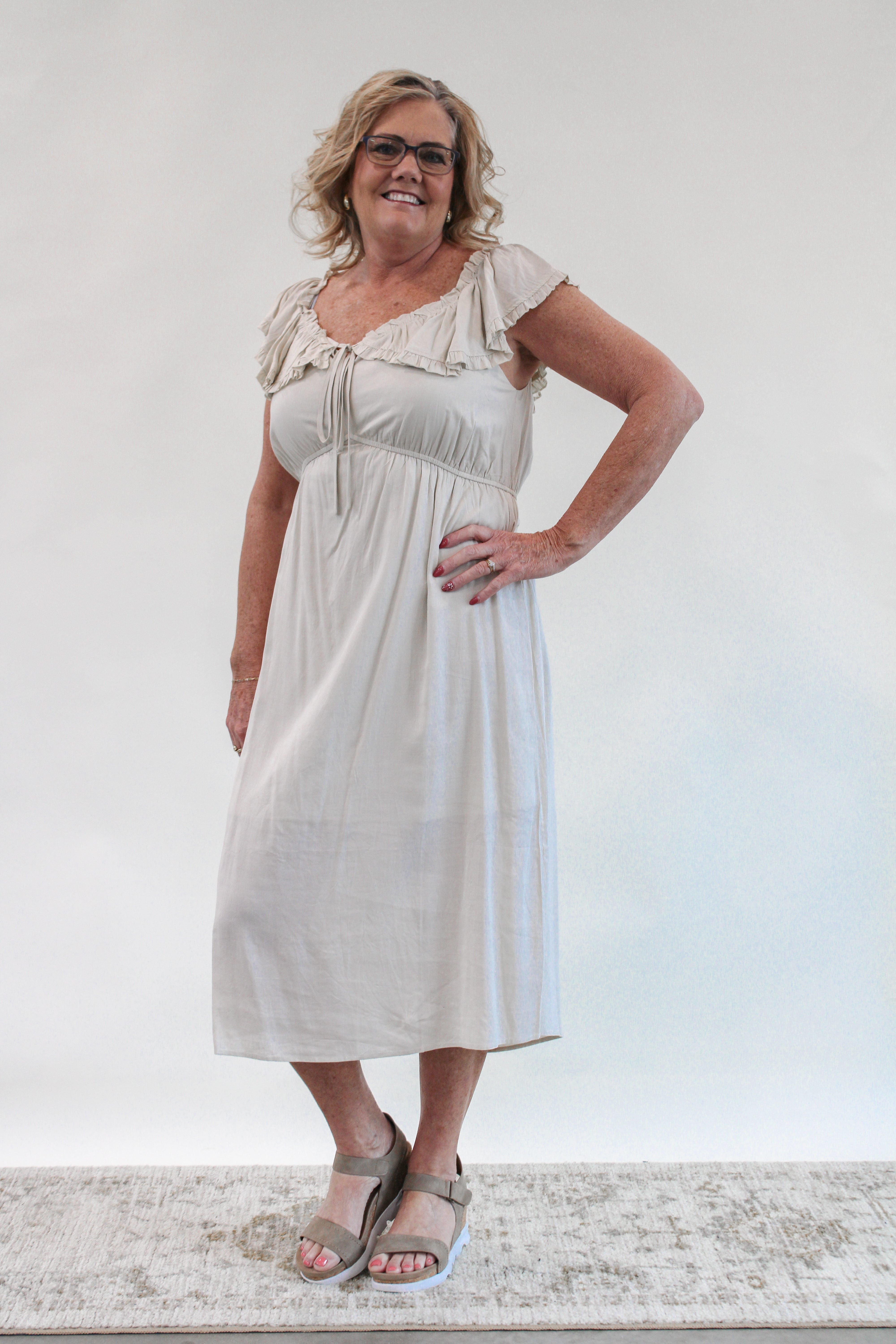 Get ready to turn heads with our Holden Linen Ruffle Midi Dress. Made from lightweight and breathable linen, this midi dress is perfect for any warm weather occasion. The ruffle top with a tie front adds a playful touch, making you the life of the party!