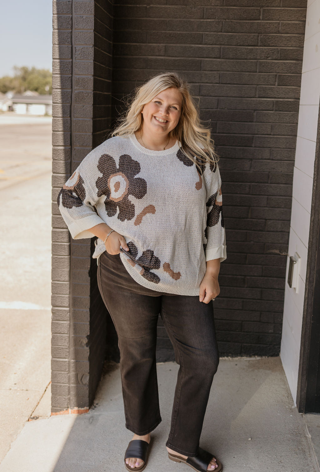 Made from 100% acrylic, this sweater features an abstract floral design in elegant neutral tones. The 3/4 sleeves add a touch of sophistication, making this sweater a must-have for any fashion-forward wardrobe. Elevate your style with this luxurious piece.