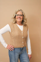 Cozy up in the JEAN Chunky Cable Knit V-Neck Vest, where classic charm meets playful style. Featuring a bold cable knit and easy button-up front, this vest adds warmth and texture to any outfit. Perfect for layering over your favorite tees or dresses, it’s your new go-to piece for comfy cool days with a fun twist.