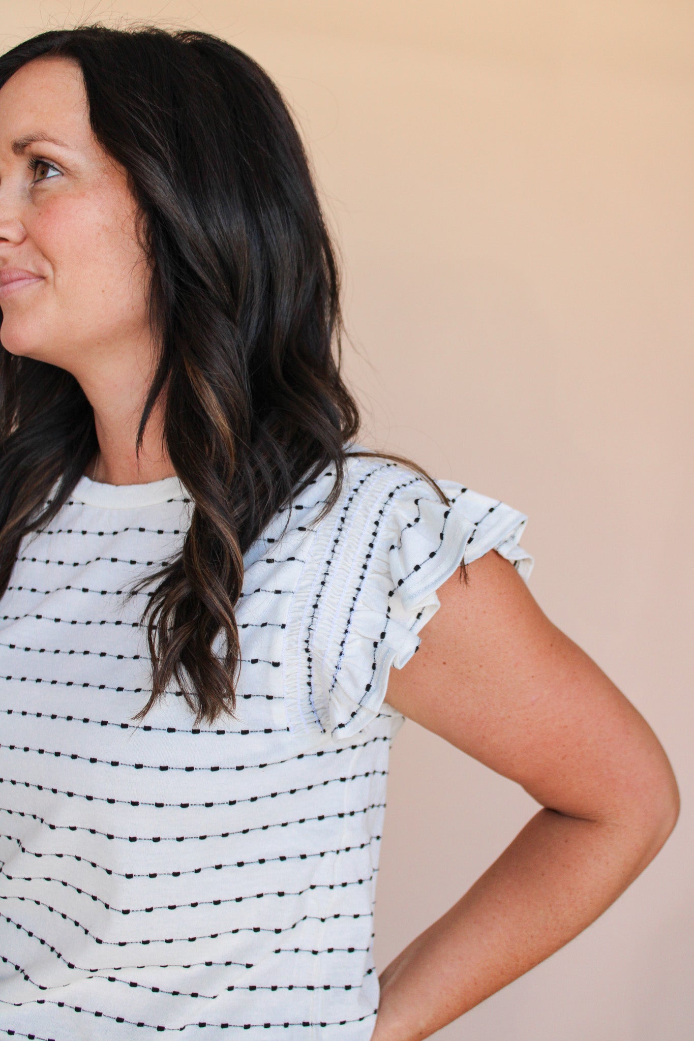 Add a splash of fun to your wardrobe with the KACYN Flutter Sleeve Knit Top. Featuring playful flutter sleeves and a classic crewneck, this striped top brings a breezy, lighthearted vibe to any outfit. Perfect for those who love a mix of comfort and charm, it’s your go-to piece for effortless style with a twist.