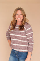 Get cozy and stylish with the KAYLOR STRIPED SWEATER. This purple striped sweater is not only fashionable, but also made with 100% polyester for ultimate comfort. Perfect for any occasion, this quirky and fun sweater is a must-have in any wardrobe.