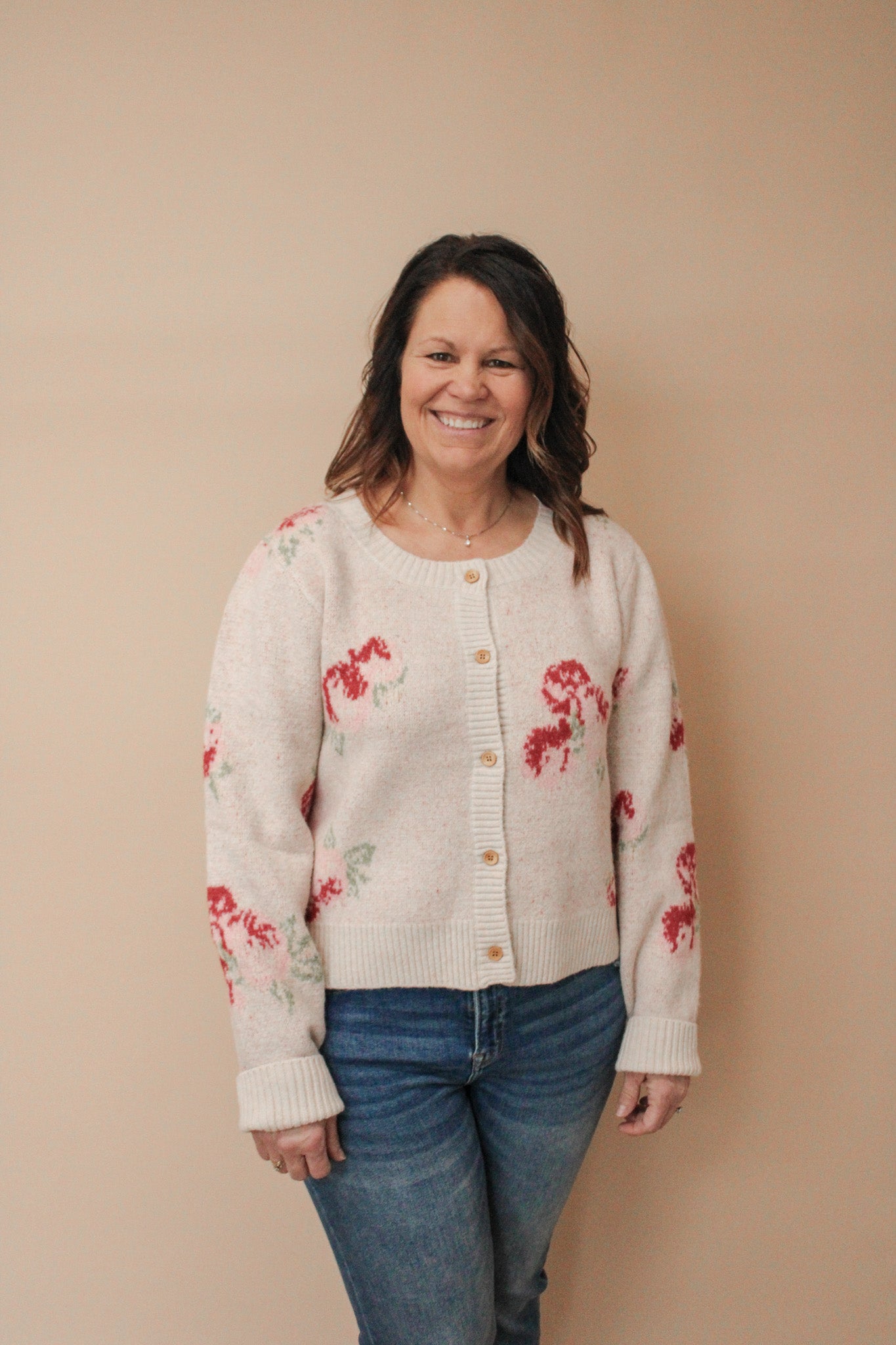 Layer up with our adorable Kitty Floral Cardigan, featuring a charming cream base adorned with delicate floral patterns in soft red and pink hues. Crafted with cozy comfort in mind, this sweet piece showcases natural wooden buttons that add a touch of rustic charm. Perfect for adding a playful pop of personality to any outfit, whether you're dressing up your everyday look or channeling your inner feline fashionista. A wardrobe essential that's as fun as it is fabulous!