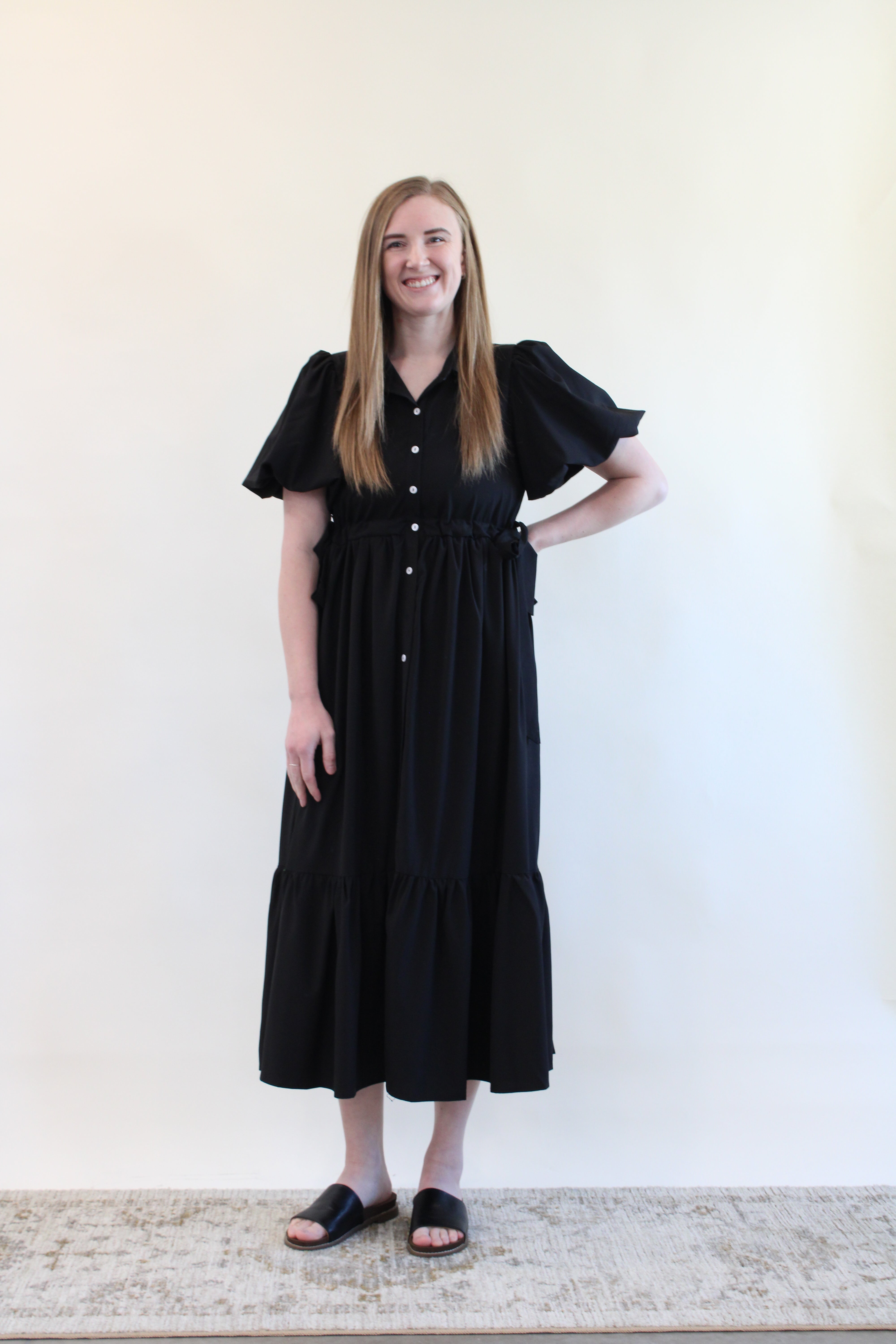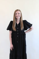Get ready to turn heads in the LAEL BUTTON DOWN MIDI DRESS! This lightweight dress features a shirt collar and button closure for a chic look. Short bubble sleeves add a playful touch, while the self tie at both sides cinches in your waist for a flattering silhouette. Fully lined and made with a soft polyester and spandex blend for ultimate comfort.
