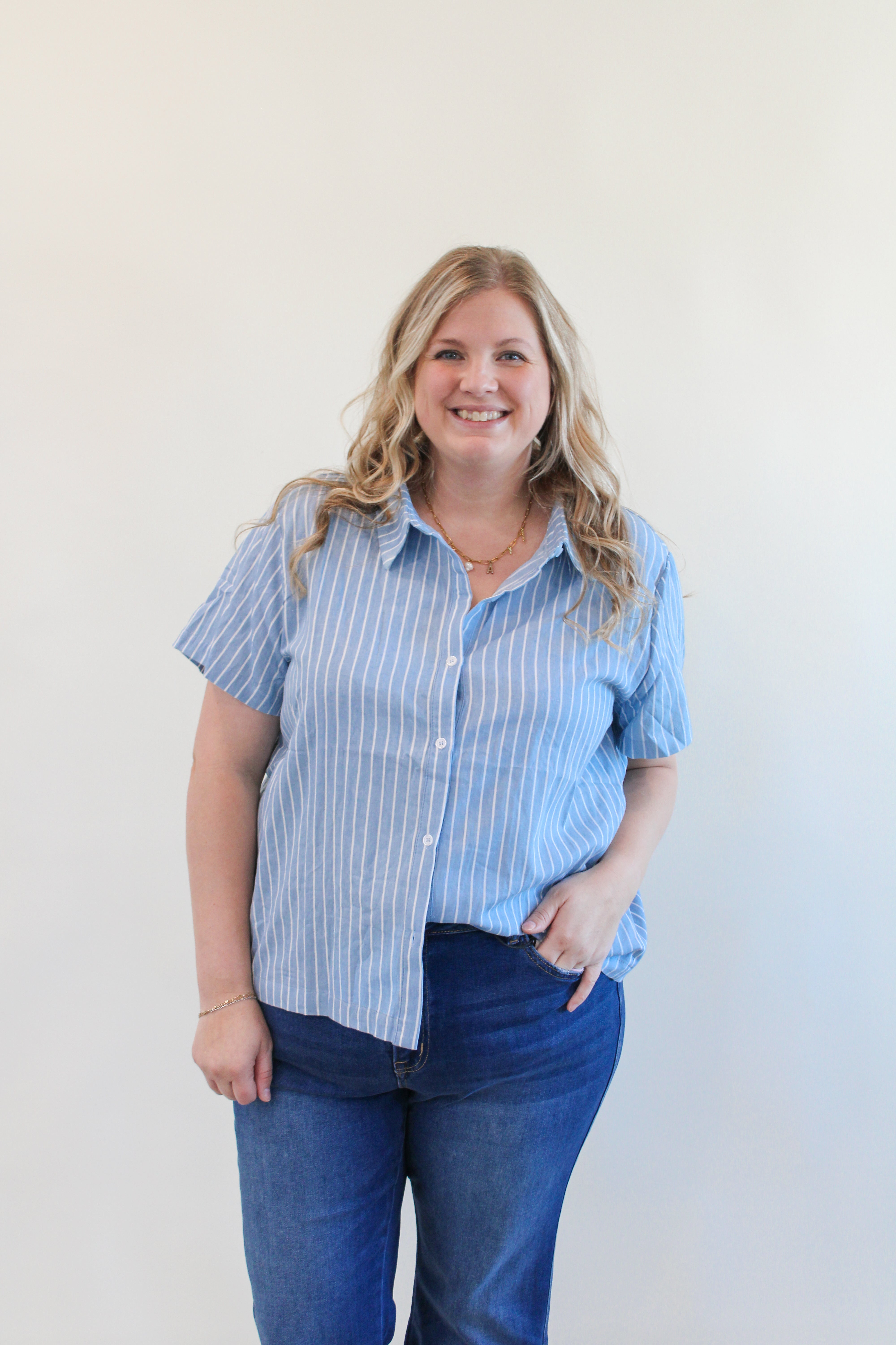 Get ready to add some flair to your wardrobe with our LILA CURVY PINSTRIPE BUTTON DOWN. This top combines a playful pinstripe pattern with functional buttons and a comfortable collar, making it both stylish and practical. Perfect for any occasion, this short sleeve top will have you standing out from the crowd in no time!
